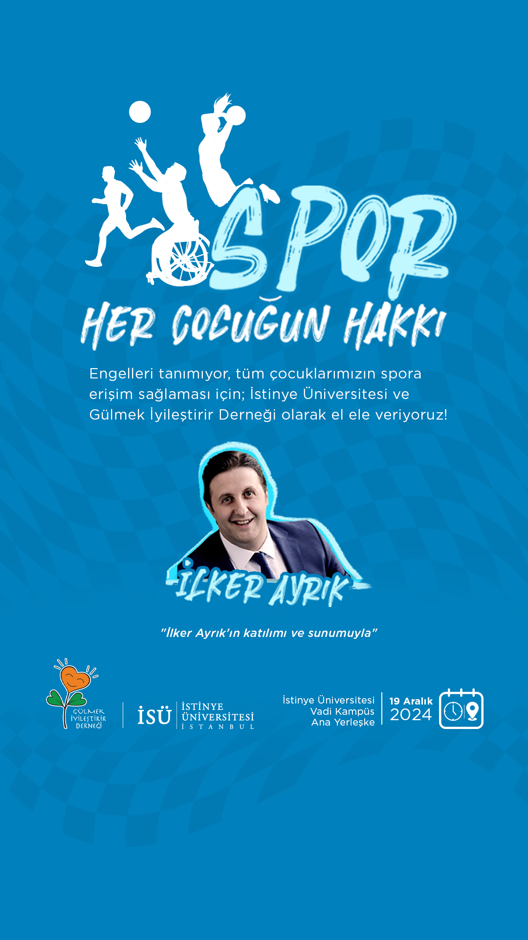 İstinye Üniversitesi ve Gülmek İyileştirir Derneği tarafından Ana Yerleşke Spor Salonu açılışı kapsamında 19 Aralık 2024 Perşembe günü, saat 16.00'da İlker Ayrık'ın sunumuyla gerçekleştirilecek olan Spor Her Çocuğun Hakkı etkinliğine davetlisiniz.