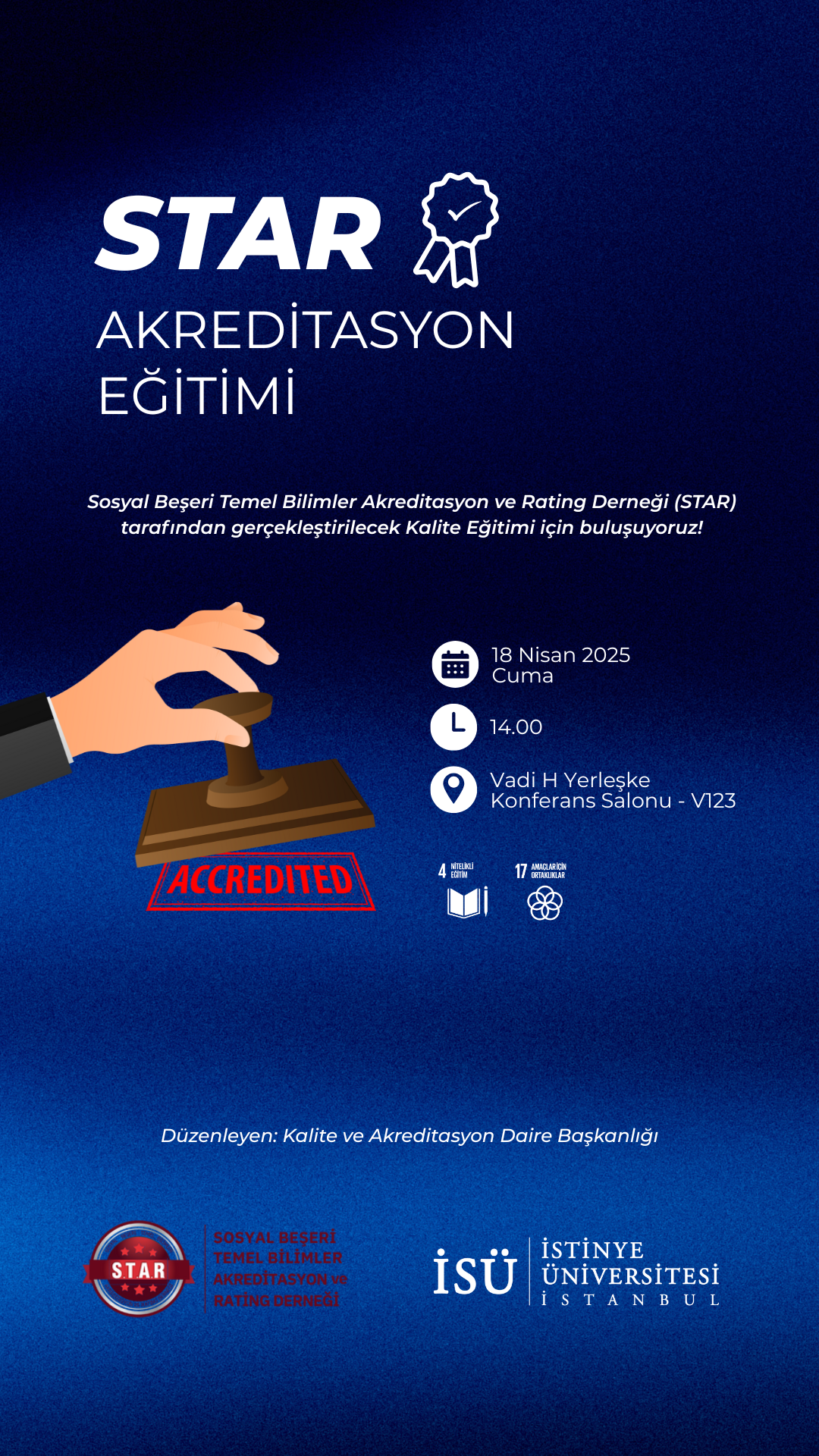 İstinye Üniversitesi Kalite ve Akreditasyon Daire Başkanlığı tarafından düzenlenen, Sosyal Beşeri Temel Bilimler Akreditasyon ve Rating Derneği (STAR) tarafından 18 Nisan 2025 tarihlerinde gerçekleştirilecek olan STAR Akreditasyon Eğitimi'ne davetlisiniz.