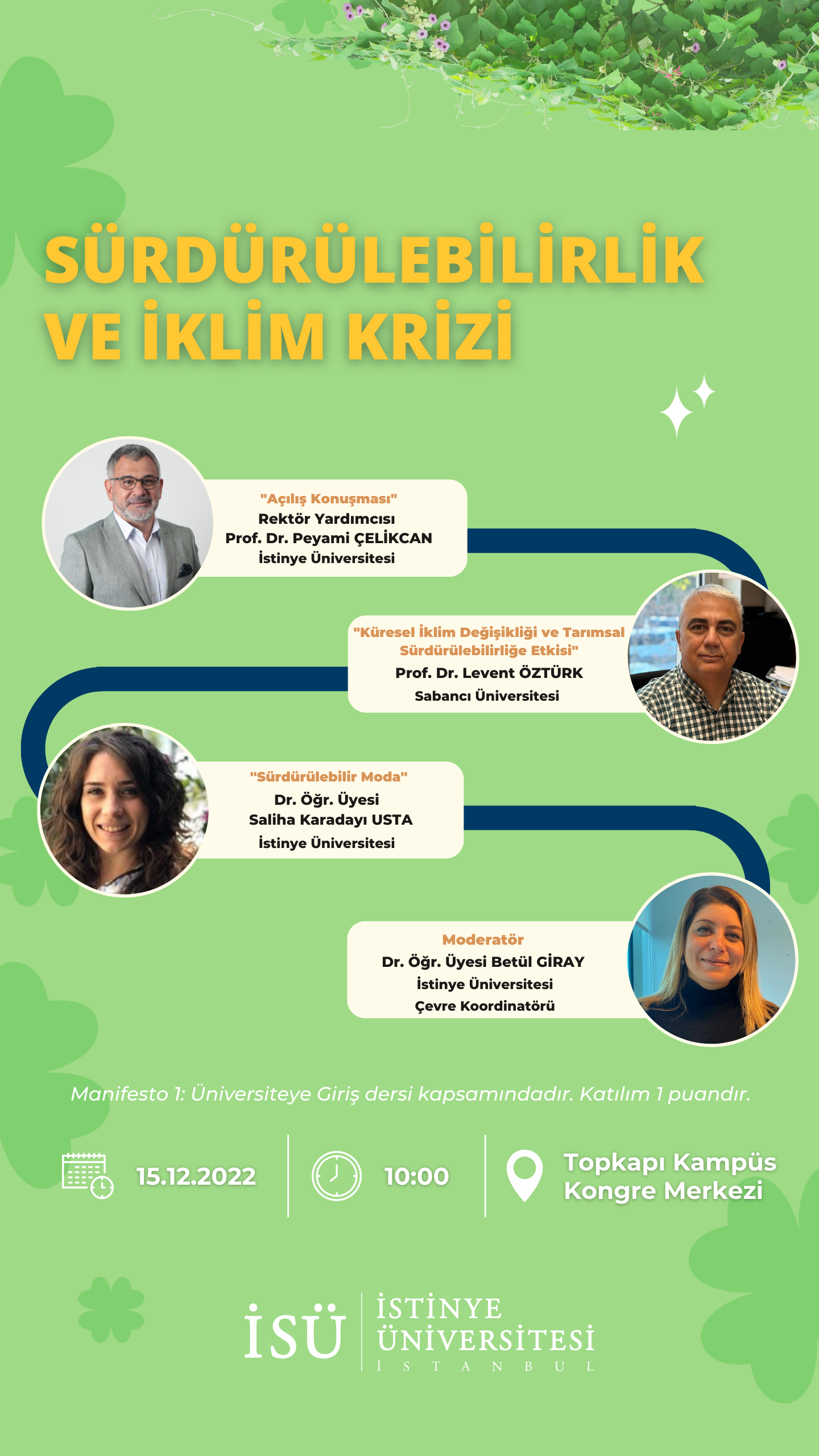 İstinye Üniversitesi Çevre Koordinatörlüğü birimi tarafından 15 Aralık Perşembe günü saat 10.00'da Topkapı Kampüs Kongre Merkezinde gerçekleştirilecek etkinliğe davetlisiniz.