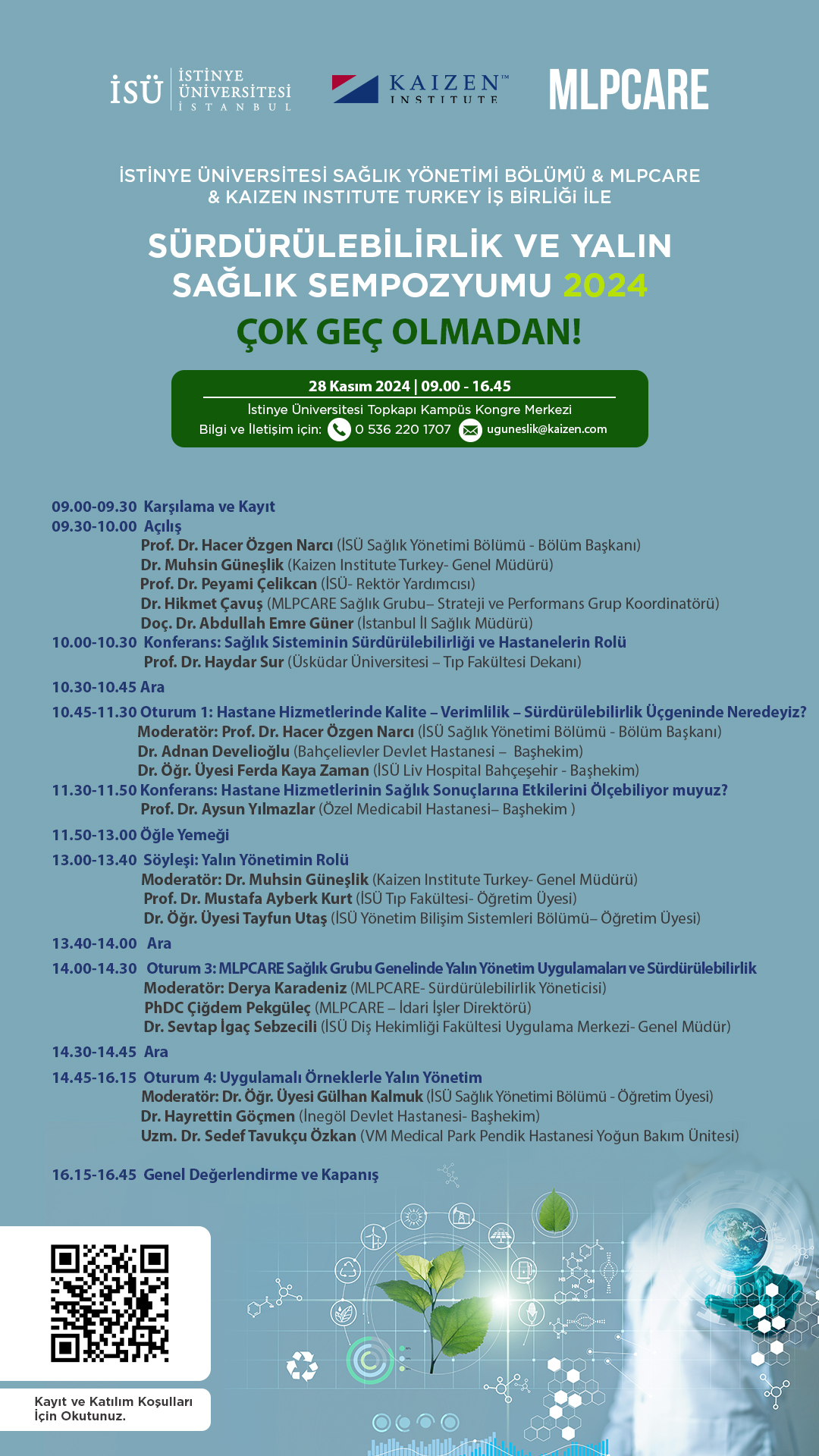 İstinye Üniversitesi Sağlık Yönetimi Bölümü, MLPCARE ve Kaizen Institute Turkey iş birliği ile 28 Kasım 2024 tarihinde saat 09.00'da Topkapı Kampüs Kongre Merkezi'nde gerçekleştirilecek olan Sürdürülebilirlik ve Yalın Sağlık Sempozyumu 2024 etkinliğine davetlisiniz.