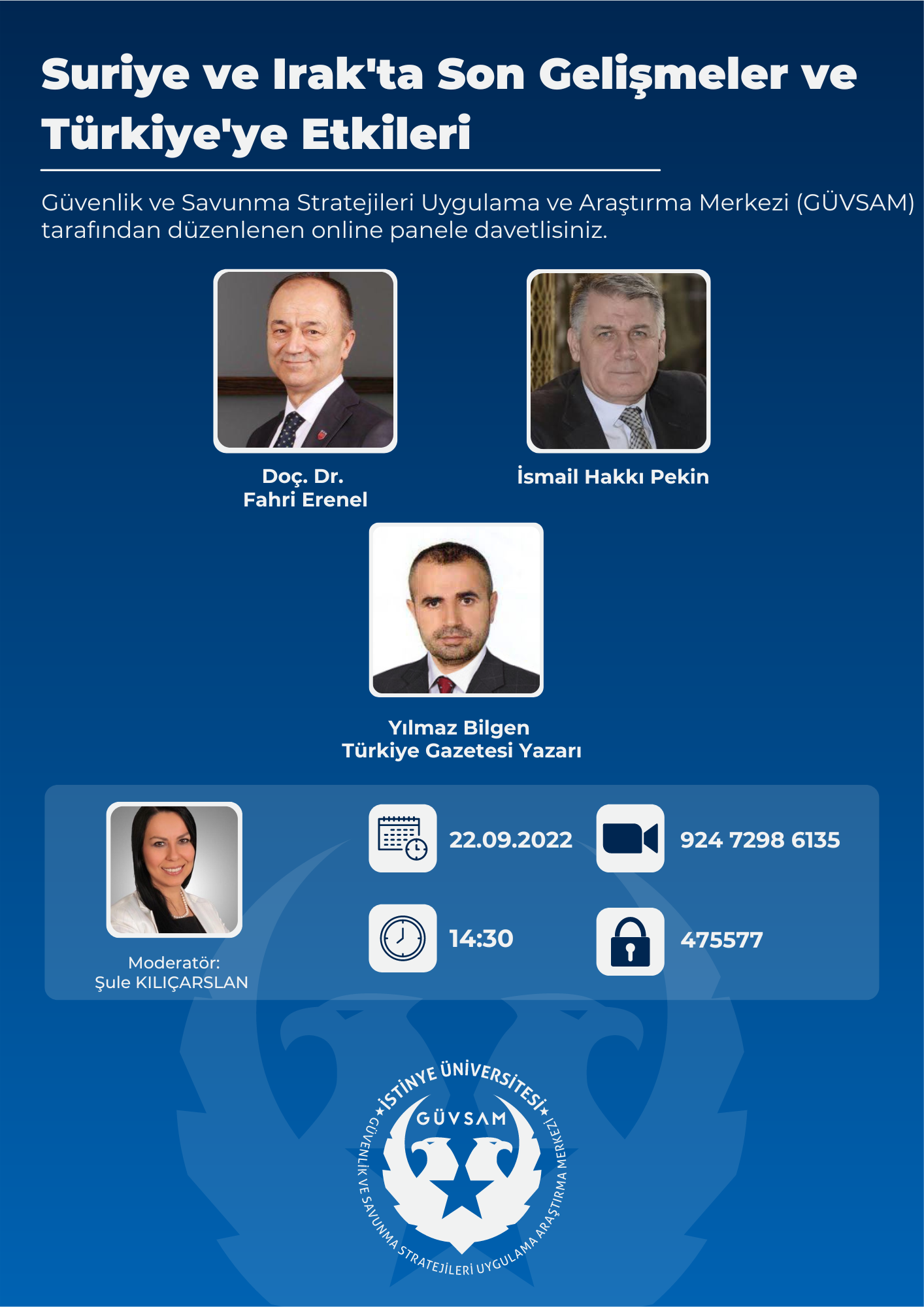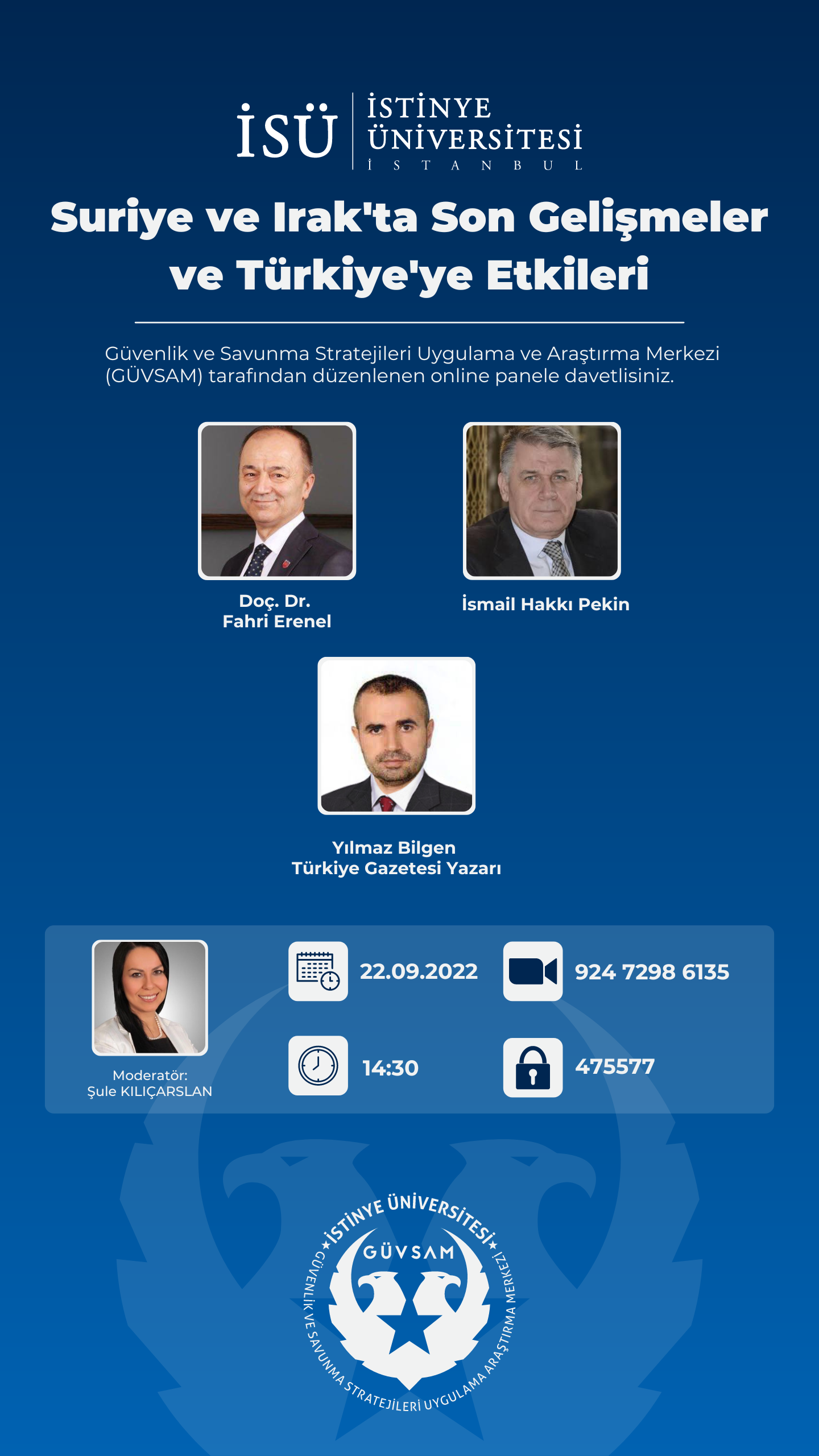 Güvenlik ve Savunma Stratejileri Uygulama ve Araştırma Merkezi (GÜVSAM) tarafından 22 Eylül Perşembe Günü saat 14.30'da çevrim içi olarak gerçekleştirilecek etkinliğe davetlisiniz.