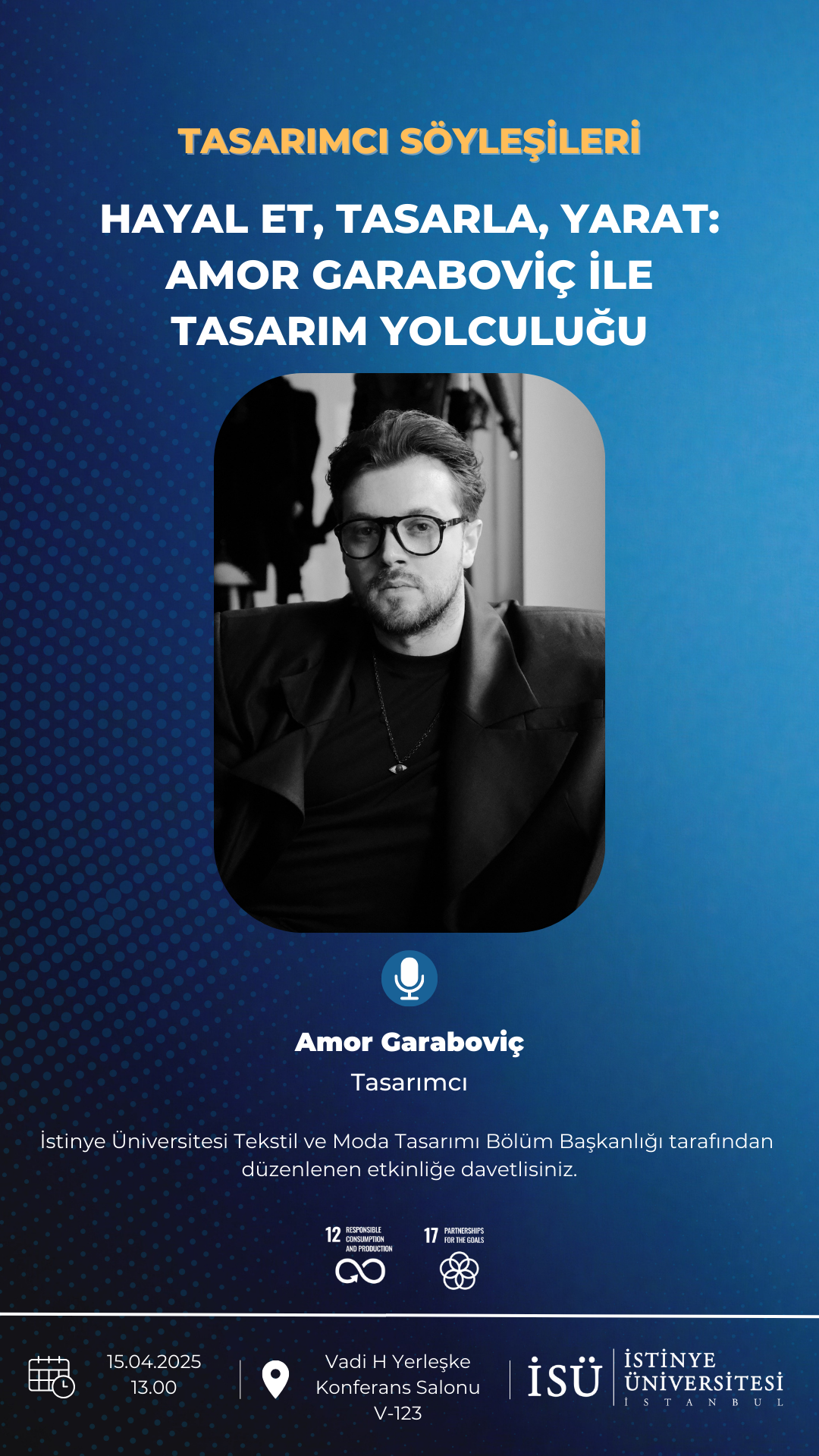 İstinye Üniversitesi Tekstil ve Moda Tasarımı Bölüm Başkanlığı tarafından 15 Nisan 2025 Salı günü, saat 13.00'da Vadi H Yerleşke V-123 Konferans Salonu'nda gerçekleştirilecek olan "Hayal Et, Tasarla, Yarat: Amor Garaboviç ile Tasarım Yolculuğu" etkinliğine davetlisiniz.