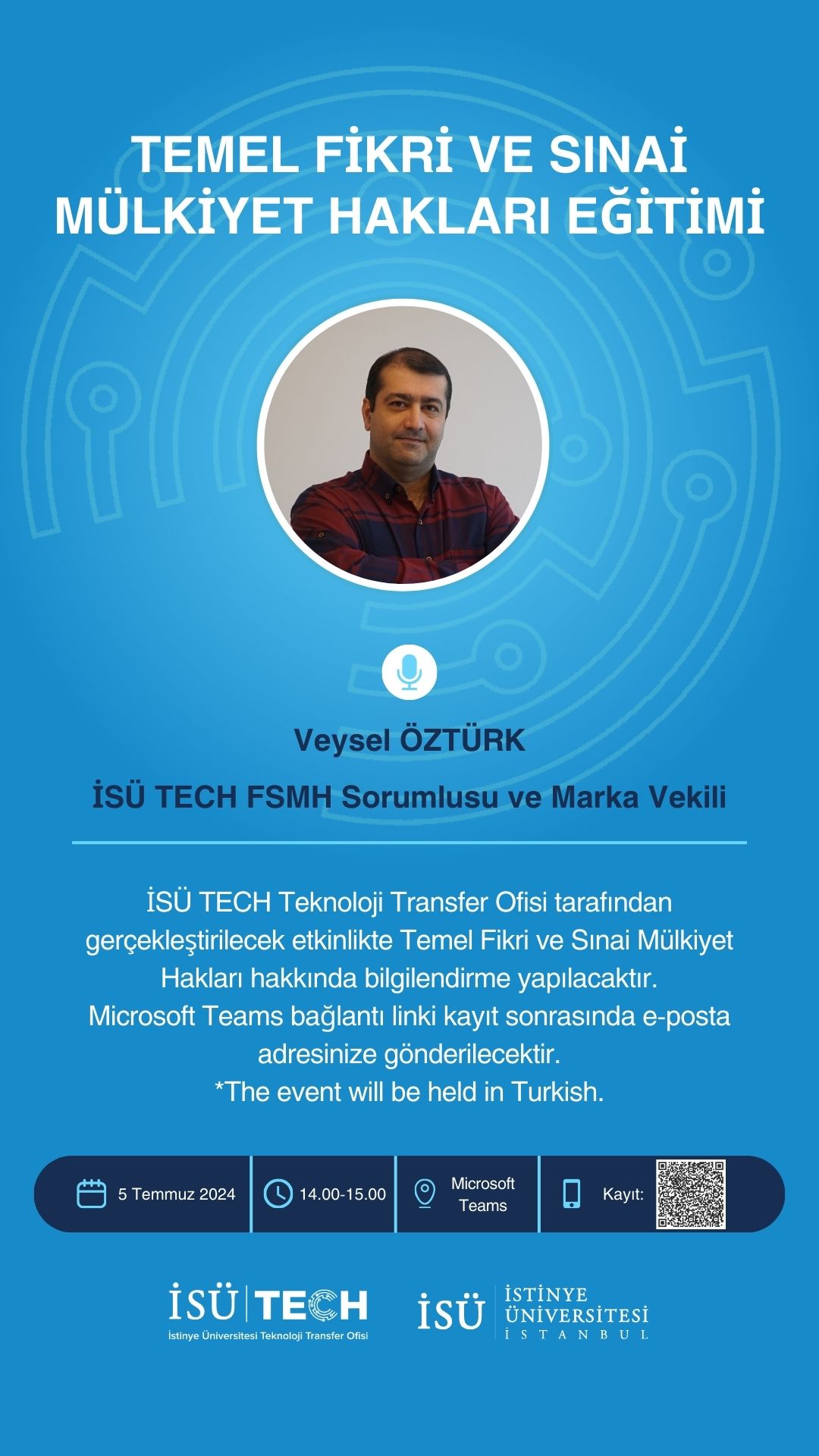 İSÜ TECH Teknoloji Transfer Ofisi tarafından 5 Temmuz Cuma günü saat 14.00'da çevrim içi olarak “Temel Fikri ve Sınai Mülkiyet Hakları Eğitimi” düzenlenecektir. İSÜ TECH FSMH Sorumlusu ve Marka Vekili Sn. Veysel Öztürk tarafından verilecek eğitime tüm akademisyenlerimiz davetlidir.