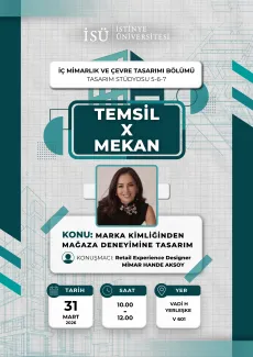 İstinye Üniversitesi, İç Mimarlık ve Çevre Tasarımı Bölümü tarafından 31 Mart 2026, saat 10.00'da gerçekleşecek olan “Temsil X Mekan: Marka Kimliğinden Mağaza Deneyimine Tasarım” isimli etkinliğe davetlisiniz.