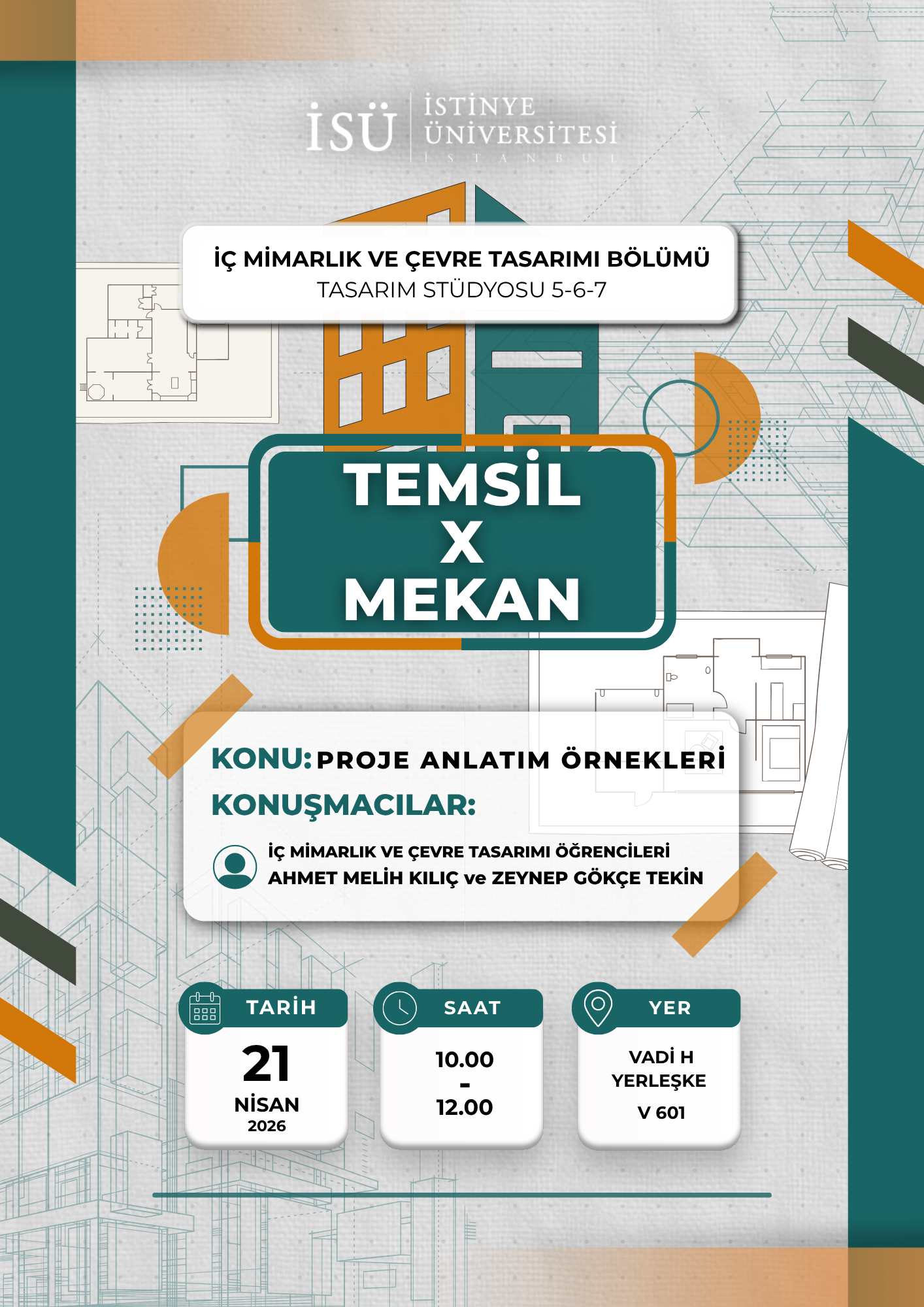 İstinye Üniversitesi, İç Mimarlık ve Çevre Tasarımı Bölümü tarafından 21 Nisan 2026, saat 10.00'da gerçekleşecek olan “Temsil X Mekan: Proje Anlatım Örnekleri” isimli etkinliğe davetlisiniz.