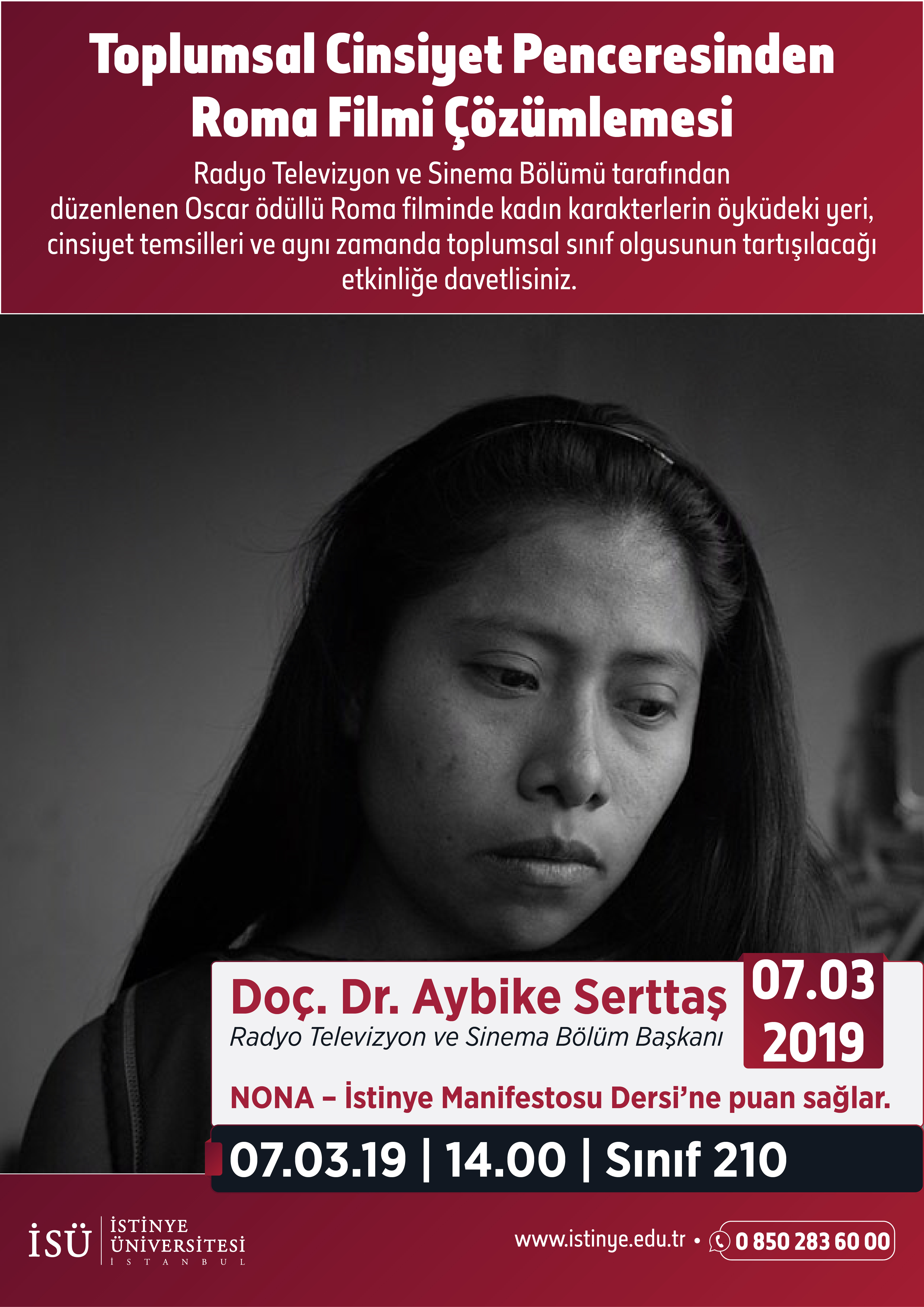 İstinye Üniversitesi Radyo, Sinema, Televizyon Bölüm Başkanı Doç. Dr. Aybike Serttaş tarafından gerçekleştirilecek “Toplumsal Cinsiyet Penceresinden Roma Filmi Çözümlemesi” başlıklı seminerde Oscar ödüllü “Roma” filminde kadın karakterlerin öyküdeki yeri, cinsiyet temsilleri ve aynı zamanda toplumsal sınıf olgusu tartışılacak.
