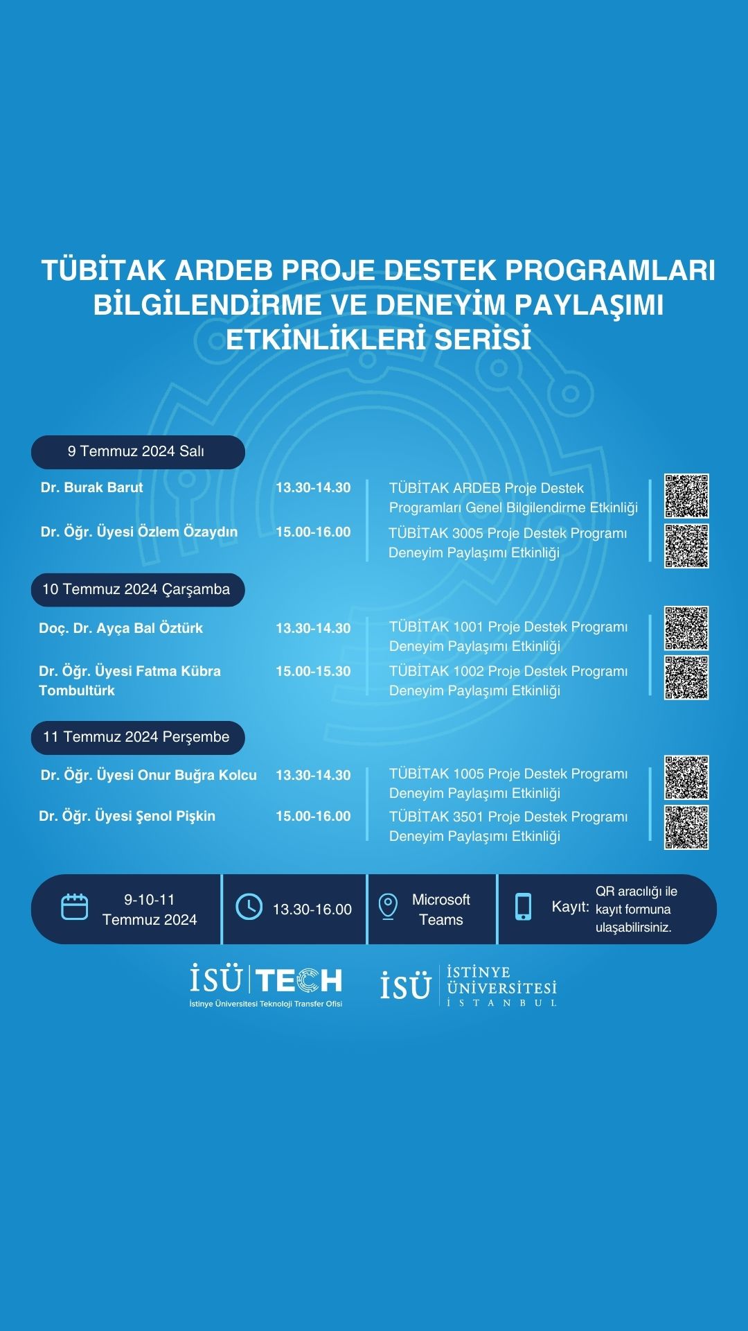 İSÜ TECH Teknoloji Transfer Ofisi tarafından 9-10-11 Temmuz 2024 tarihleri, 13.30-16.00 saatleri arasında çevrim içi olarak “TÜBİTAK ARDEB Proje Destek Programları Bilgilendirme ve Deneyim Paylaşımı Etkinlikleri Serisi” düzenlenecektir. Etkinlik Serisine tüm akademisyenlerimiz davetlidir.