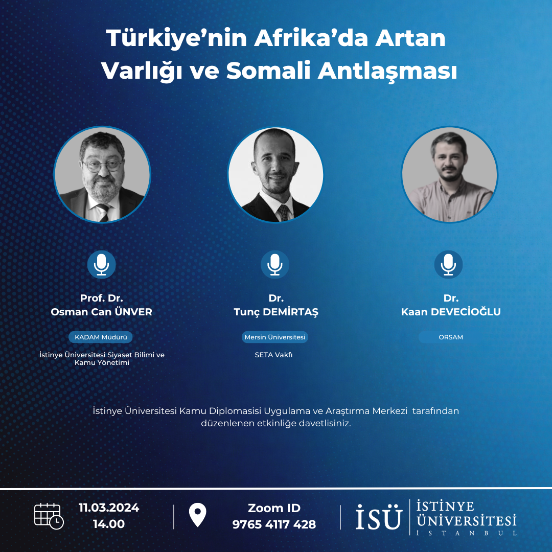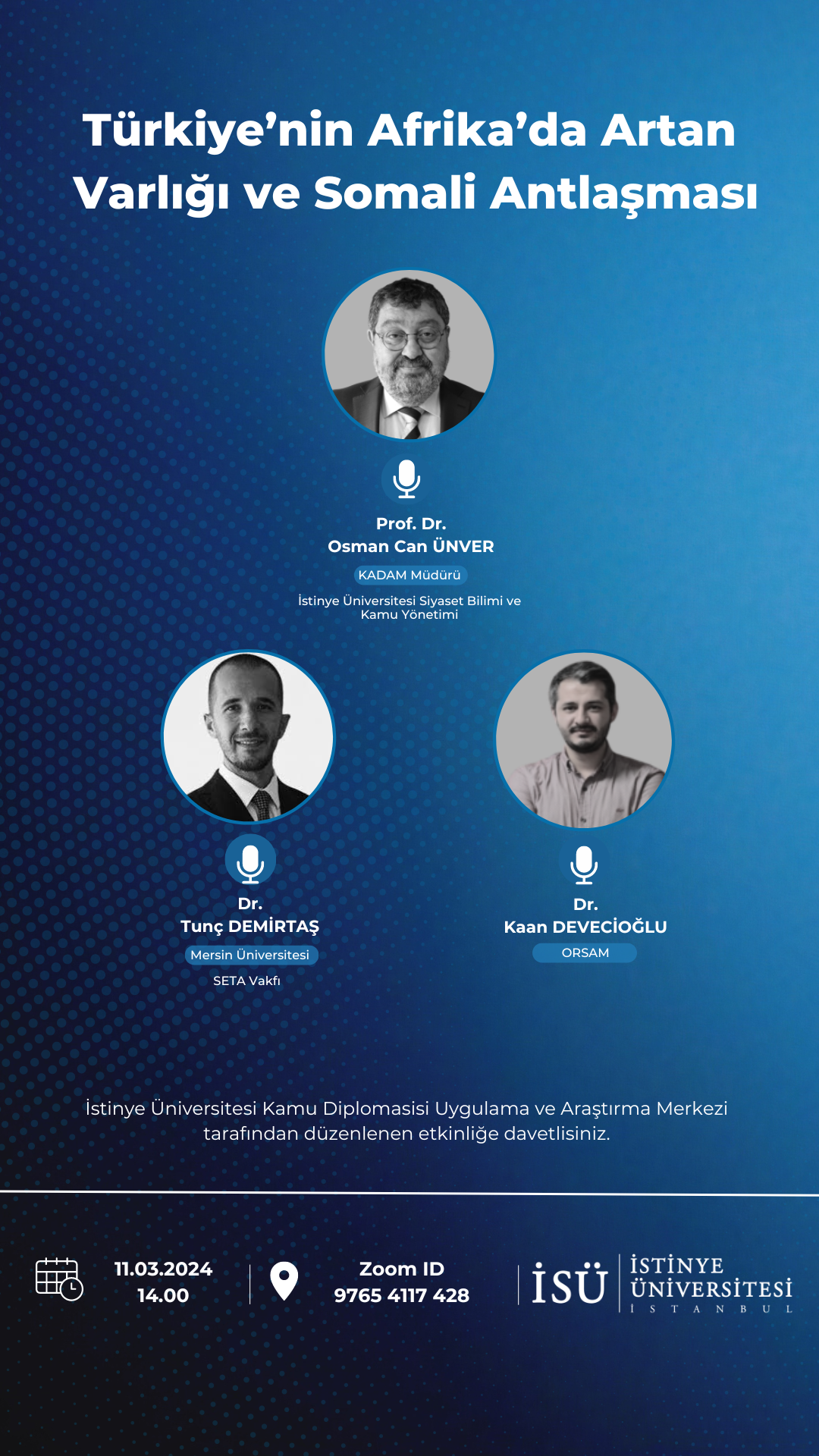 İstinye Üniversitesi, Kamu Diplomasisi Uygulama ve Araştırma Merkezi tarafından 11 Mart 2024 Pazartesi günü saat 14:00'de çevrim içi olarak gerçekleştirilecek etkinliğe davetlisiniz.