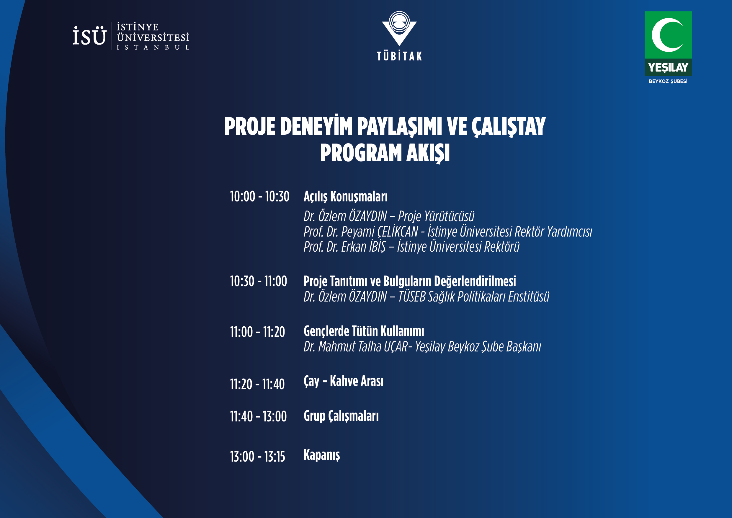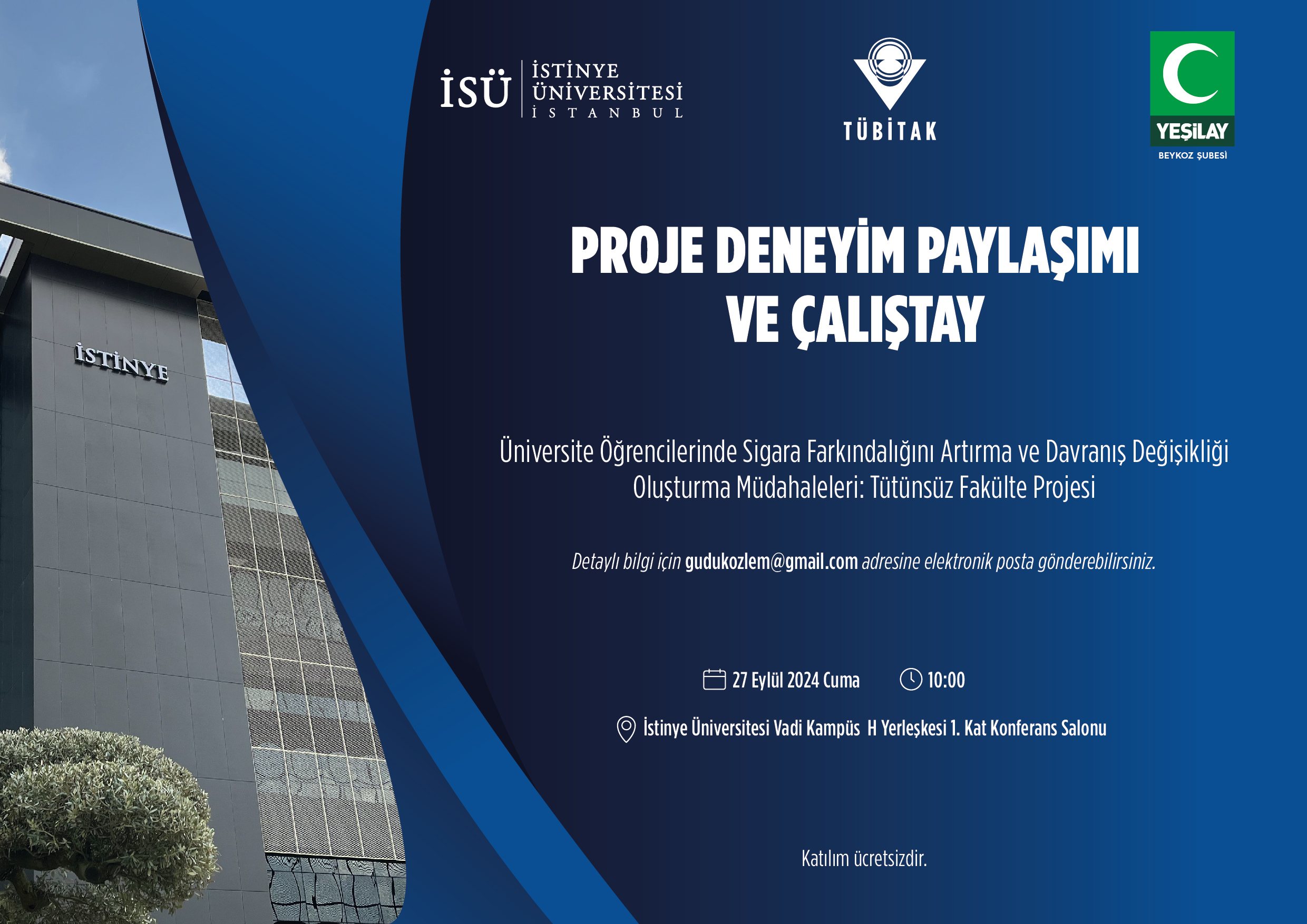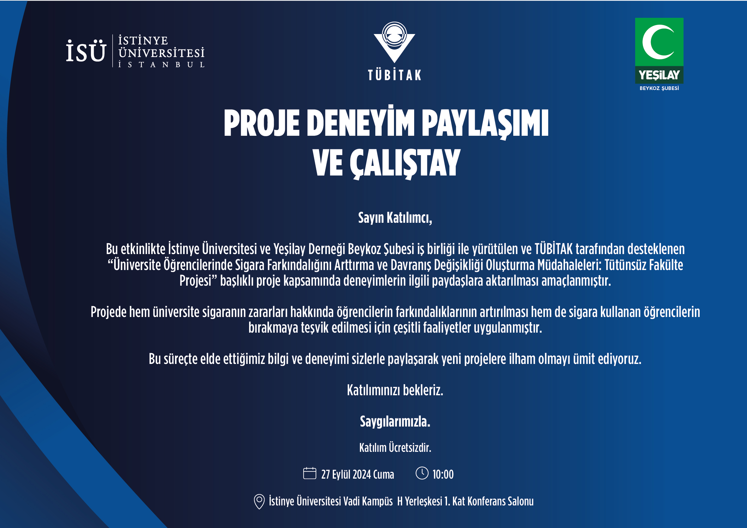 İstinye Üniversitesi ve Yeşilay Derneği Beykoz Şubesi iş birliği ile yürütülen ve TÜBİTAK tarafından desteklenen “Üniversite Öğrencilerinde Sigara Farkındalığını Arttırma ve Davranış Değişikliği Oluşturma Müdahaleleri: Tütünsüz Fakülte Projesi” başlıklı proje deneyim paylaşımı ve çalıştaya davetlisiniz.