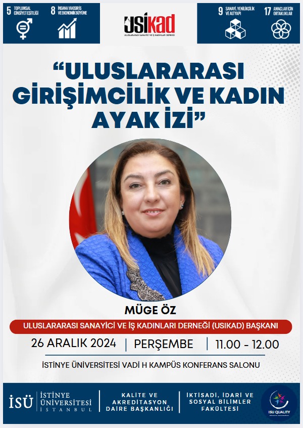 İstinye Üniversitesi İktisadi, İdari ve Sosyal Bilimler Fakültesi, Kalite ve Akreditasyon Daire Başkanlığı ve İstinye Üniversitesi Kalite Topluluğu tarafından 26 Aralık 2024 Perşembe günü saat 11.00'de İstinye Üniversitesi Vadi H Kampüs Konferans Salonu'nda Uluslararası Sanayici ve İş Kadınları Derneği Başkanı Sayın Müge ÖZ 'ün katılımlarıyla  düzenlenecek olan "Uluslararası Girişimcilik ve Kadın Ayak İzi" konulu etkinliğe davetlisiniz.