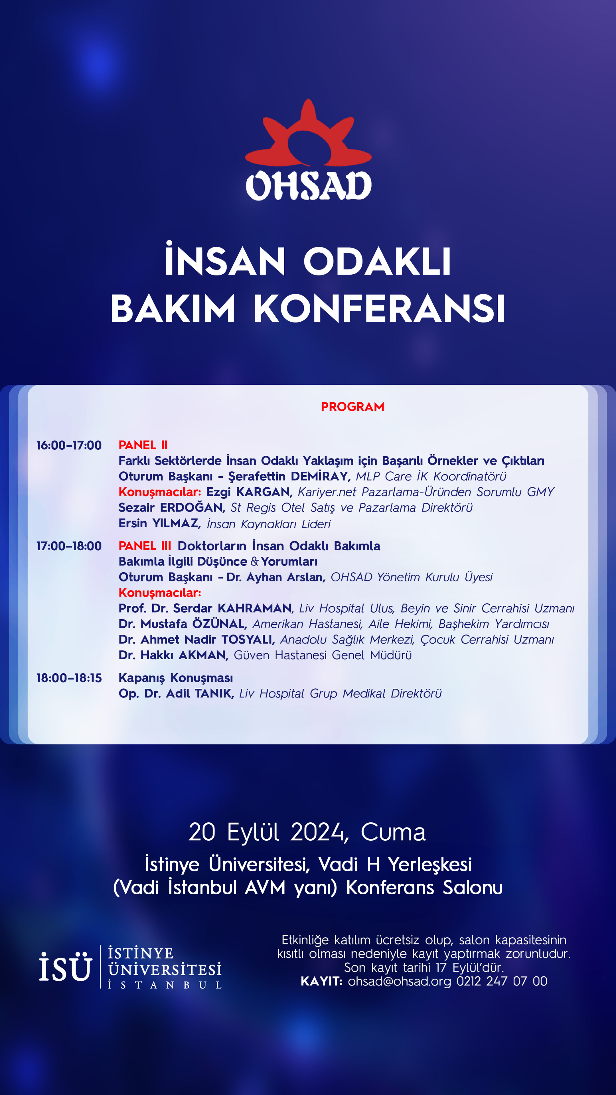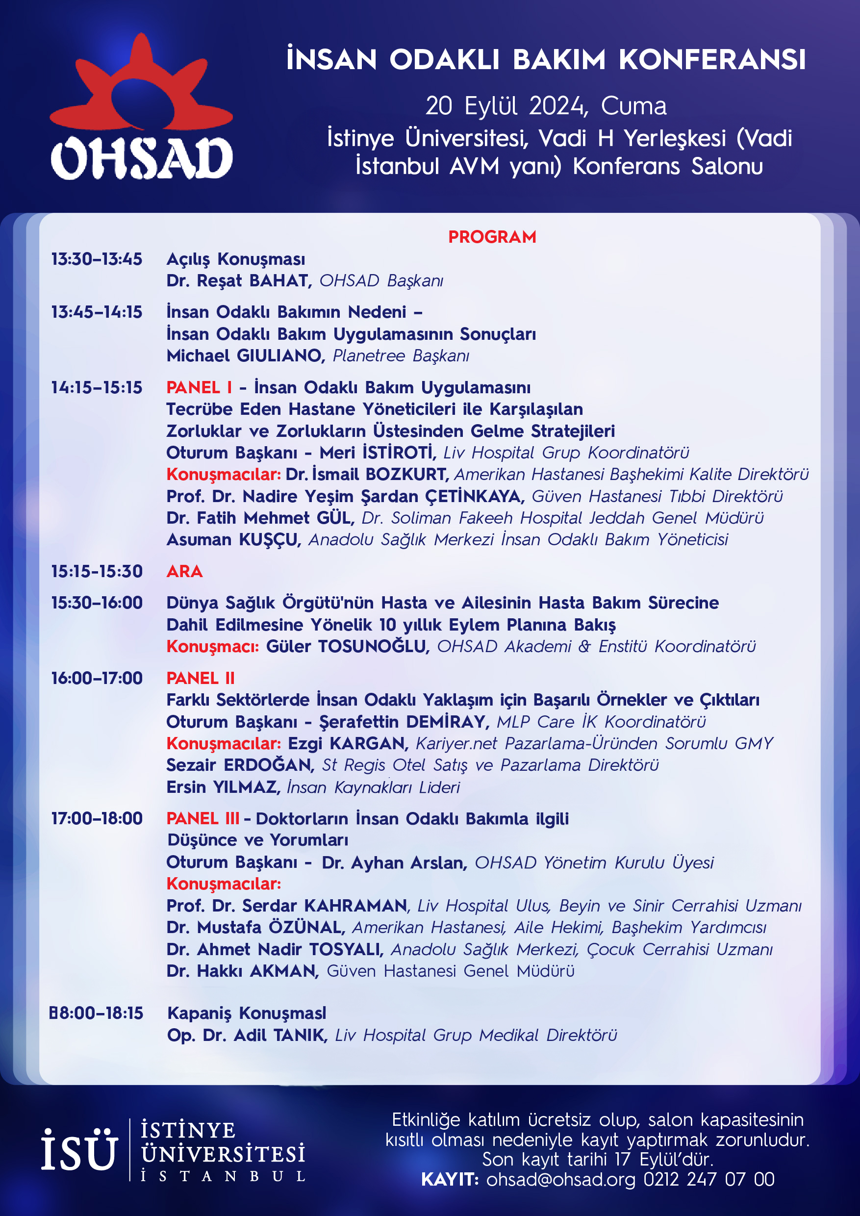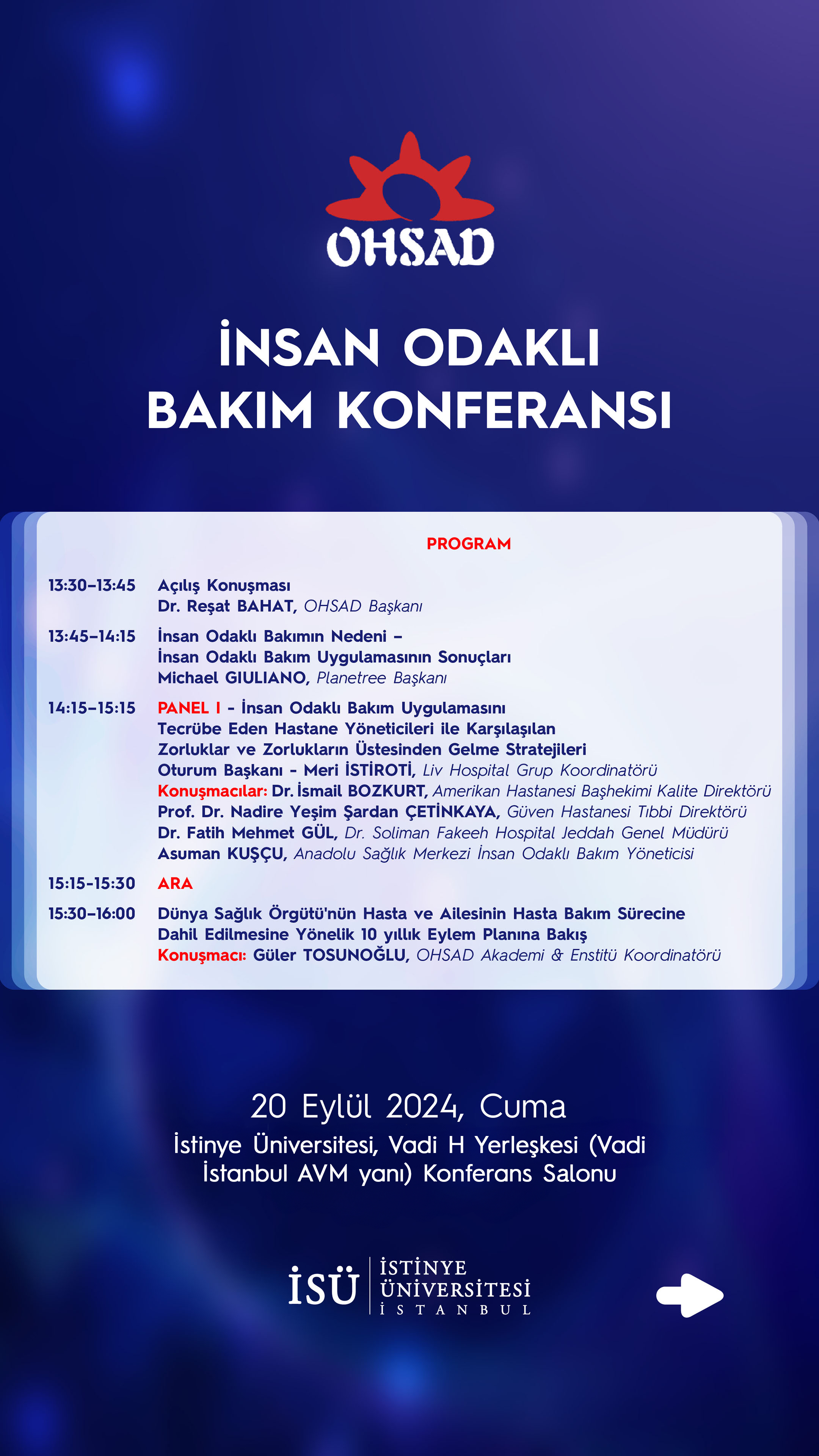 Liv Hospital tarafından 20 Eylül 2024 tarihinde, 13.30-18.15 saatleri arasında İstinye Üniversitesi, Vadi H Yerleşkesi, Konferans Salonu'nda “Uluslararası Planetree - İnsan Odaklı Bakım Konferansı” düzenlenecektir.