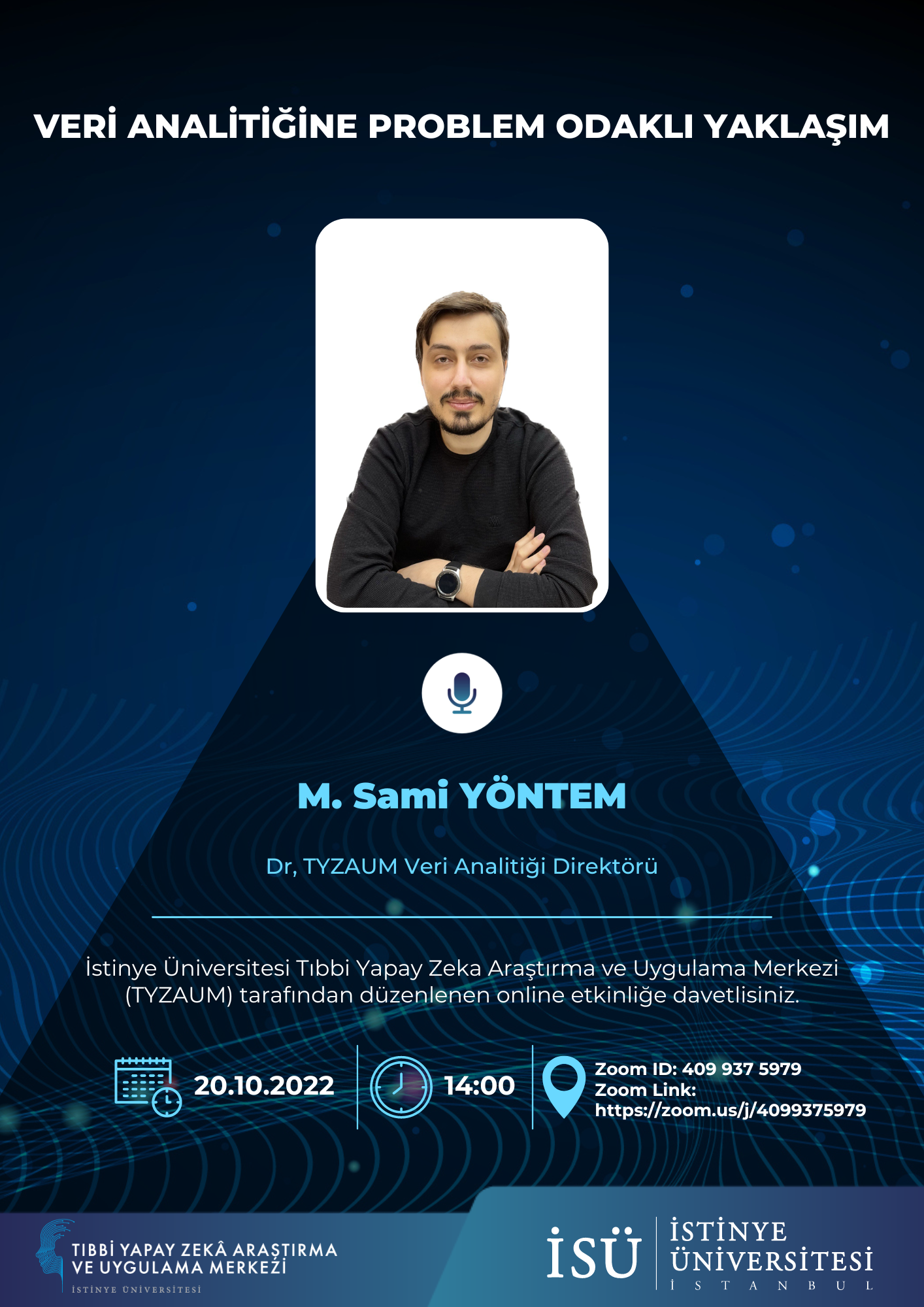 İstinye Üniversitesi Tıbbi Yapay Zeka Araştırma ve Uygulama Merkezi (TYZAUM) tarafından 20 Ekim Perşembe Günü saat 14.00'de çevrim içi olarak gerçekleştirilecek etkinliğe davetlisiniz.