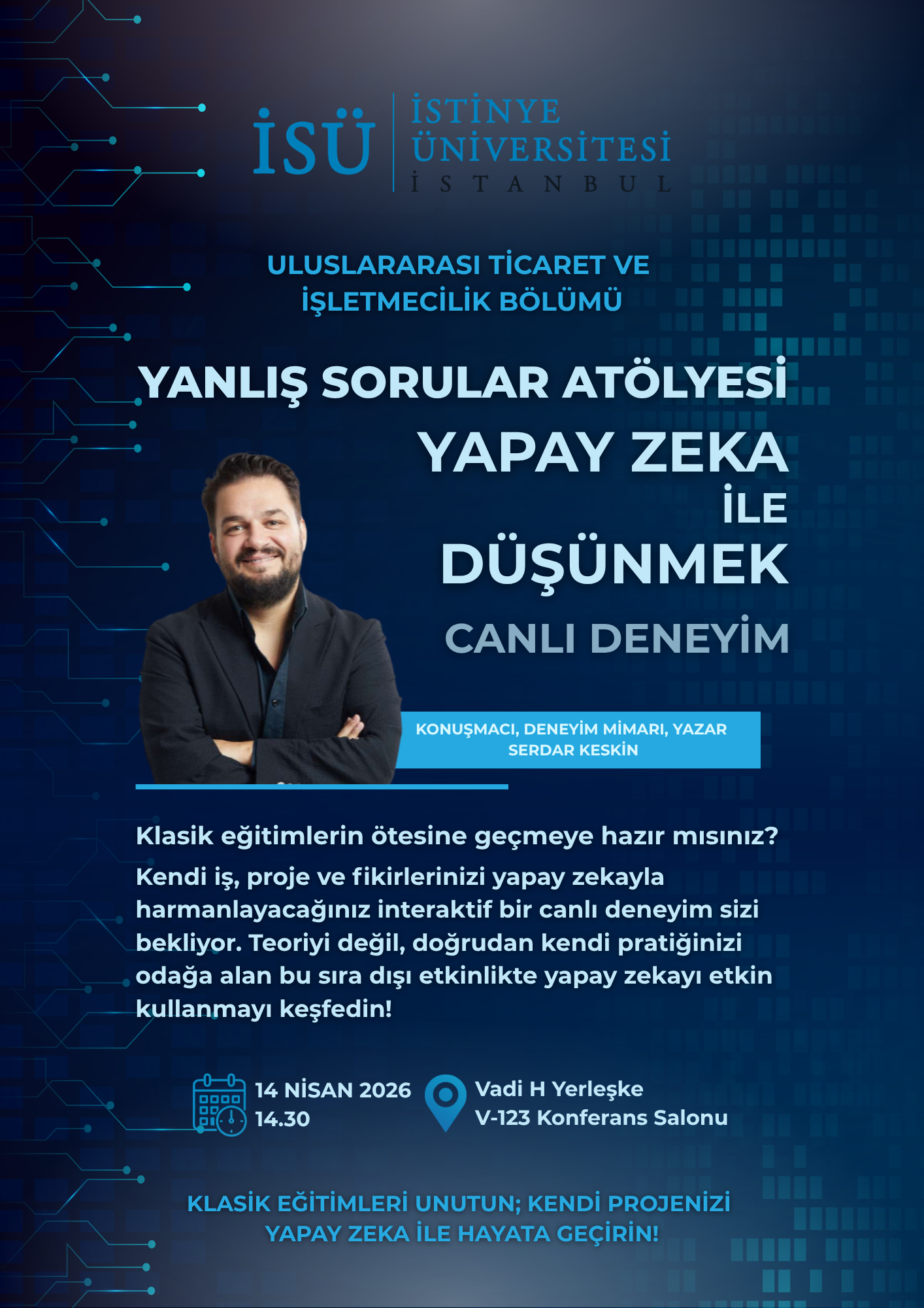 İstinye Üniversitesi, Uluslararası Ticaret ve İşletmecilik Bölümü tarafından 14 Nisan 2026, saat 14.30'da gerçekleşecek olan “Yanlış Sorular Atölyesi: Yapay Zeka ile Düşünmek” isimli etkinliğe davetlisiniz.