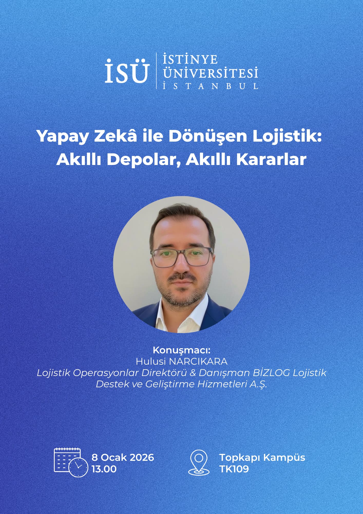 İstinye Üniversitesi, Lojistik Programı tarafından 8 Ocak 2026, saat 13.00'de gerçekleşecek olan “Yapay Zekâ ile Dönüşen Lojistik: Akıllı Depolar, Akıllı Kararlar” isimli etkinliğe davetlisiniz.