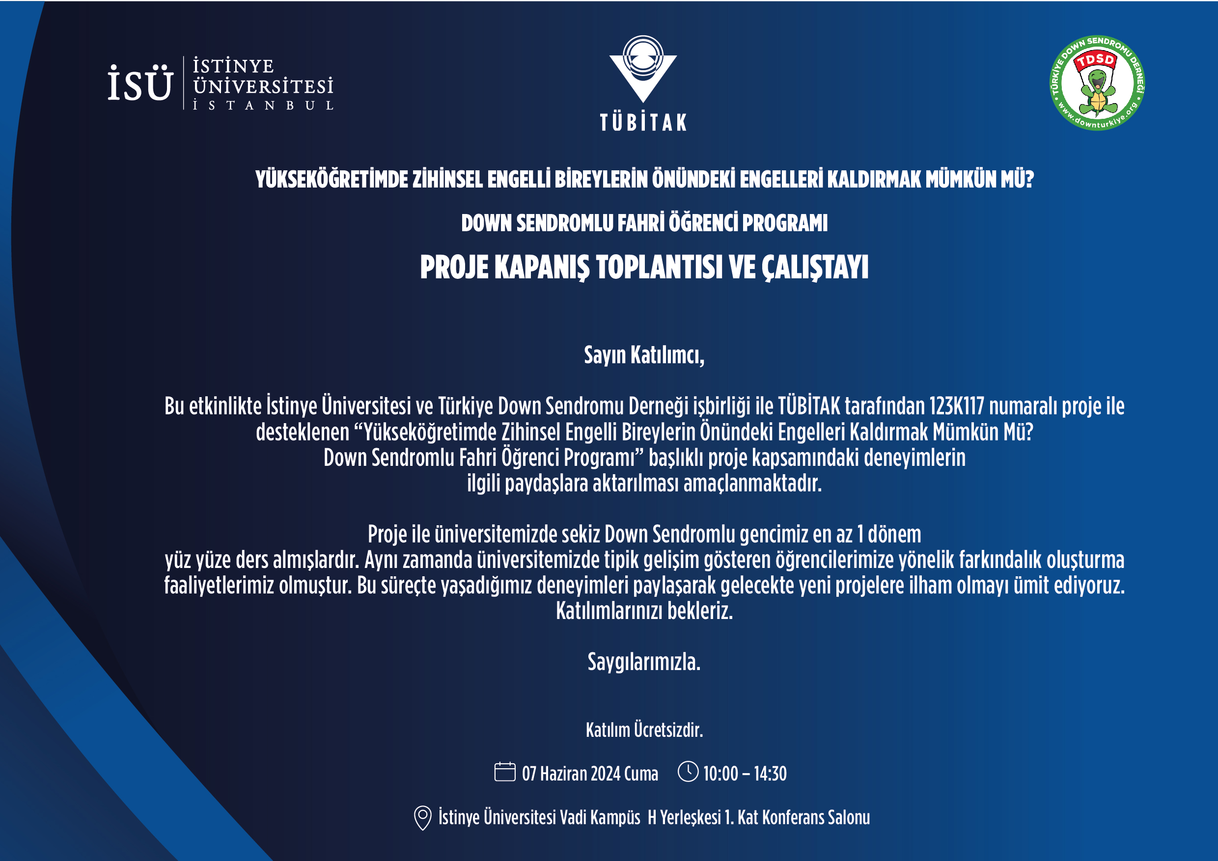 Etkinlik: Yükseköğretimde Zihinsel Engelli Bireylerin Önündeki Engelleri Kaldırmak Mümkün Mü? Down Sendromlu Fahri Öğrenci Programı Proje Kapanış Toplantısı ve Çalıştayı