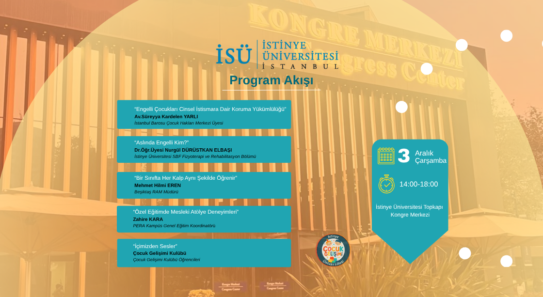 İstinye Üniversitesi, Sağlık Bilimleri Fakültesi, Çocuk Gelişimi Bölümü ve Çocuk Gelişimi Kulübü iş birliği ile 3 Aralık 2025 tarihinde Topkapı Kongre Merkezinde gerçekleştirilecek “Zihinlerdeki Engelleri Aşmaya Var mısın?” etkinliğine davetlisiniz.