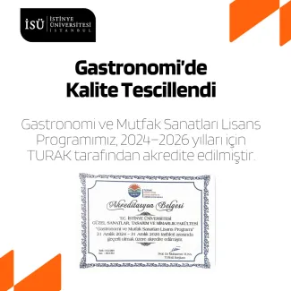 İstinye Üniversitesi Güzel Sanatlar, Tasarım ve Mimarlık Fakültesi bünyesinde yer alan Gastronomi ve Mutfak Sanatları Lisans Programı, Türkiye Turizm Akademisyenleri Derneği’ne bağlı Turizm Eğitimi Değerlendirme ve Akreditasyon Kurulu (TURAK) tarafından 31 Aralık 2024 – 31 Aralık 2026 tarihleri arasında geçerli olmak üzere akredite edilmiştir.