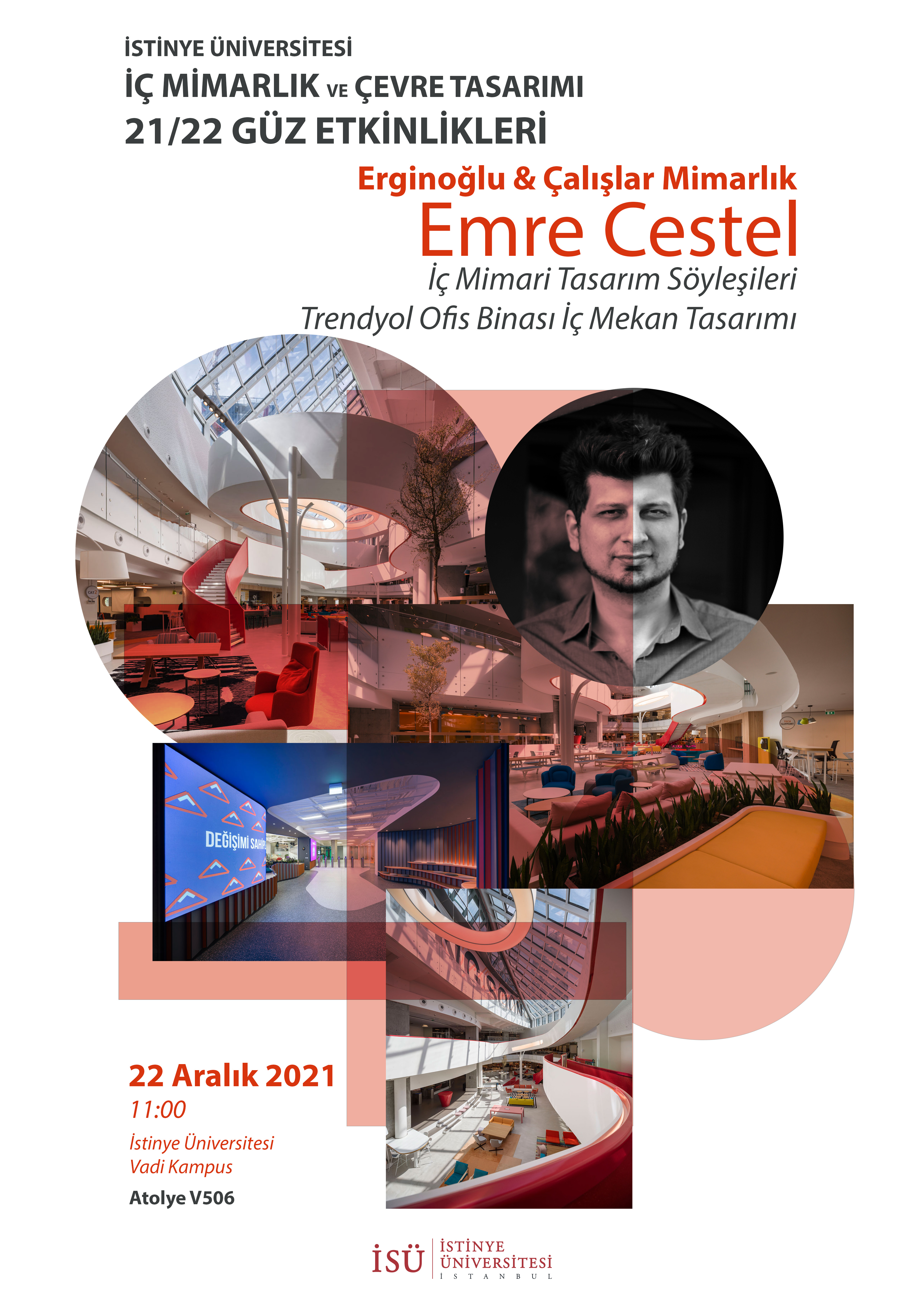 1993 yılında Kerem Erginoğlu ve Hasan Çalışlar tarafından kurulan Erginoğlu&Çalışlar tasarım ofisi, mimarlık, kurumsal kimlik ve kentsel tasarım alanlarında projeler geliştirmekte, uygulama ve kontrol yapmaktadır. 2020 yılında Erginoğlu&Çalışlar tarafından tamamlanan ‘Trendyol Campus’ projesinin, ekip yürütücüsü Y. Mimar Emre Cestel eşliğinde, İstinye Üniversitesi İç Mimarlık ve Çevre Tasarımı Bölümü Proje 3 ve Proje 5 ders kapsamında anlatılacaktır. Etkinliğimiz 22.12.21 tarihinde 14.00 da V506 nolu atölyede gerçekleştirilecektir.