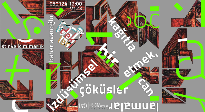 İstinye Üniversitesi Güzel Sanatlar Tasarım ve Mimarlık Fakültesi İç Mimarlık ve Çevre Tasarımı Bölümü tarafından gerçekleştirilen İçindekiler: Spekülatif Mekân Araştırmaları ilk etkinliği için Bahar Avanoğlu’nu konuk ediyor. Avanoğlu’nun, “Kağıtla bir Etmek, İzdüşümsel Çöküşler | Canlanmalar” adlı sunumu 5 Ocak 2024 saat 12:00’de İstinye Üniversitesi Vadi H Yerleşkesi V123 nolu konferans salonunda gerçekleşecek. Etkinliğe katılım herkese açıktır.