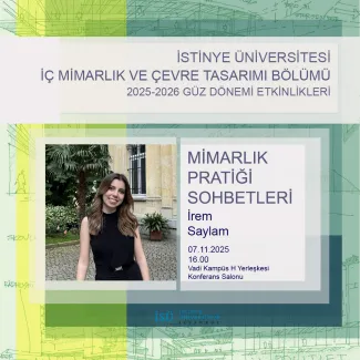 İç Mimarlık ve Çevre Tasarımı Bölümü tarafından düzenlenen Mimarlık Pratiği Sohbetleri kapsamında, bölüm mezunlarımızdan İç Mimar İrem Saylam’ın katılımıyla bir söyleşi gerçekleştirilmiştir. Etkinlik, 7 Kasım 2025 tarihinde saat 16.00’da Vadi Kampüs H Yerleşkesi Konferans Salonu’nda düzenlenmiştir.