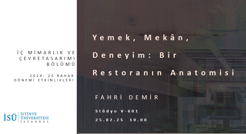 İç Mimarlık ve Çevre Tasarımı Bölümü Tasarım Stüdyosu 6 kapsamında, önceki dönemde yürütülen “yeme-içme ve deneyim mekânları” teması doğrultusunda, “Yemek, Mekân, Deneyim: Bir Restoranın Anatomisi” başlıklı etkinlik, Fahri Demir’in katılımıyla gerçekleştirilecektir.