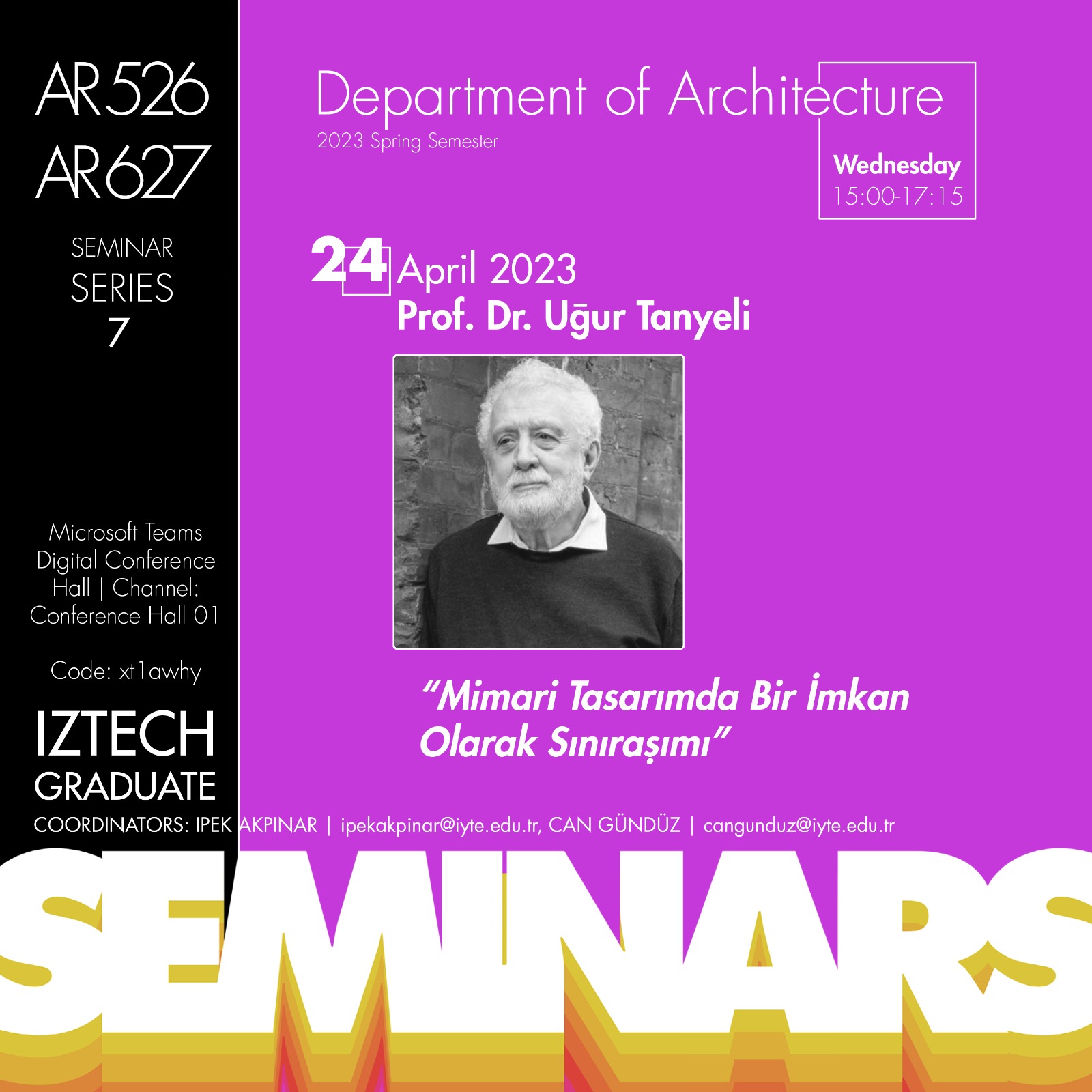 IZTECH lisansüstü seminerlerinin 7.'si, Uğur Tanyeli'nin "Mimari Tasarımda Bir İmkan Olarak Sınıraşımı" konulu konuşması ile 24 Nisan'da gerçekleşiyor.