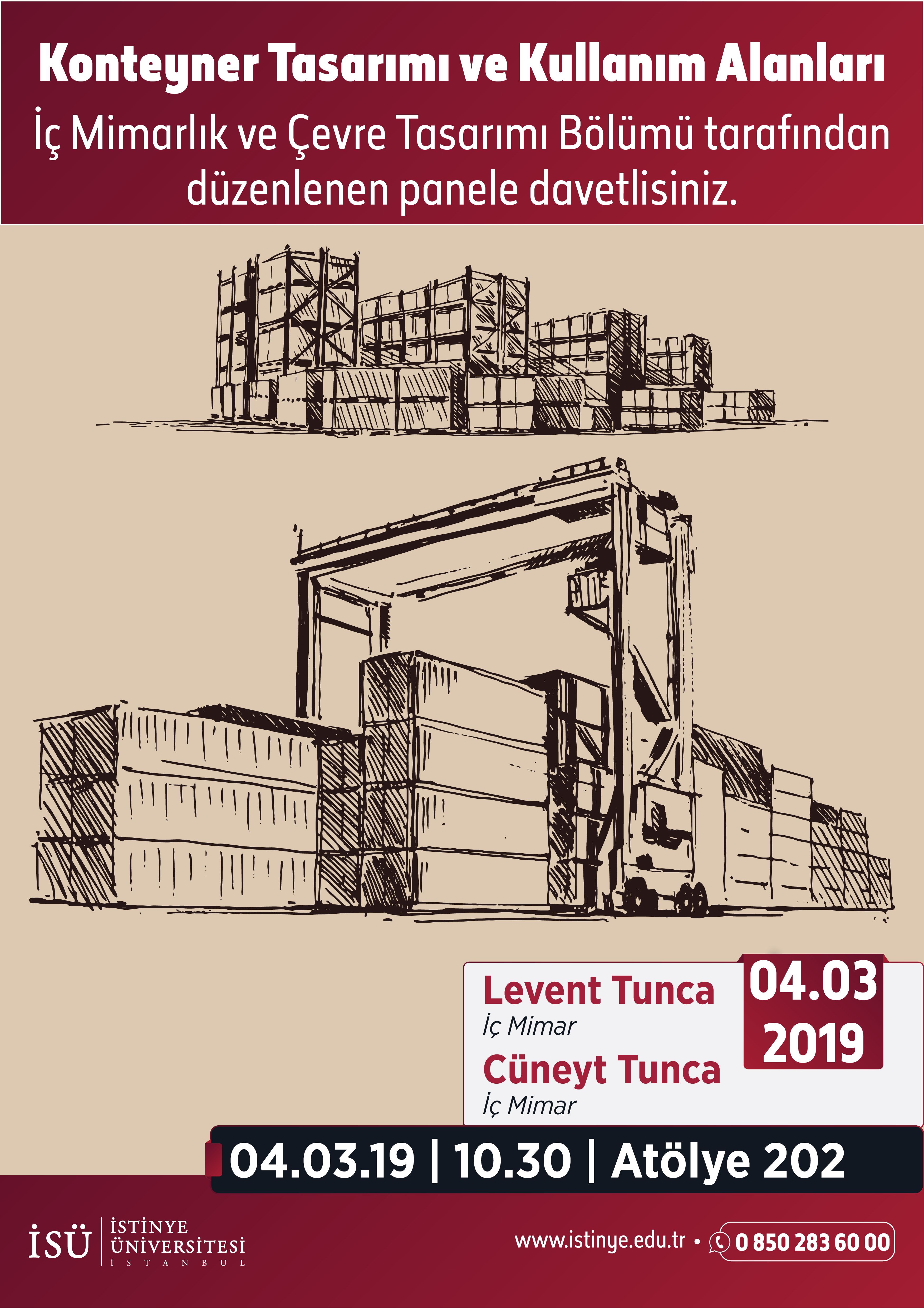 İstinye Üniversitesi İç Mimarlık ve Çevre Tasarımı bölümü tarafından düzenlenen “Konteyner Tasarımı ve Kullanım Alanları” başlıklı etkinlik, iç mimar Levent TUNCA ve Cüneyt TUNCA’nın katılımıyla 04 Mart Pazartesi günü İstinye Üniversitesi Topkapı Kampüsü’nde gerçekleşti. Seminerler dışarıdan katılıma açık ve ücretsizdir.
