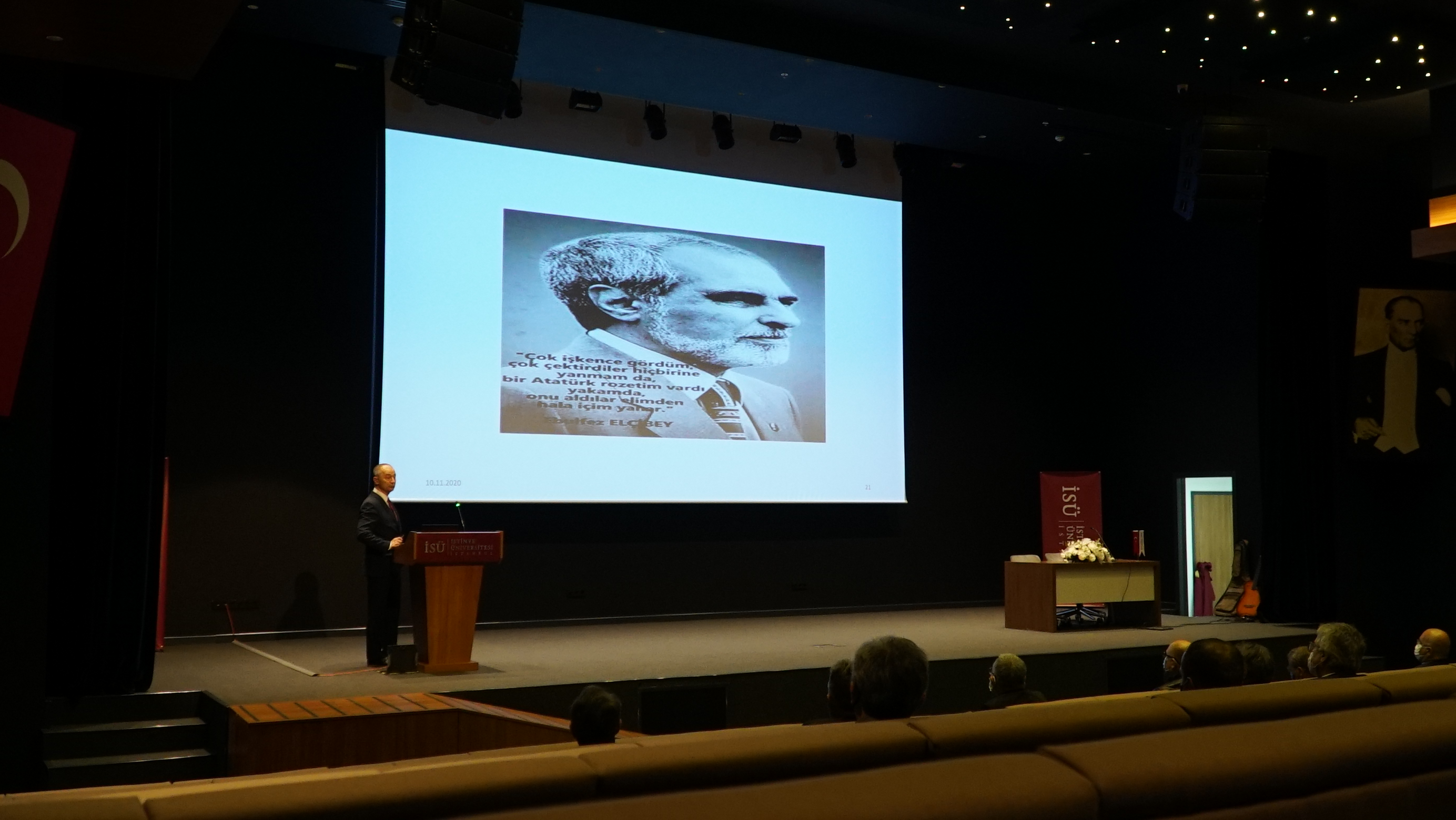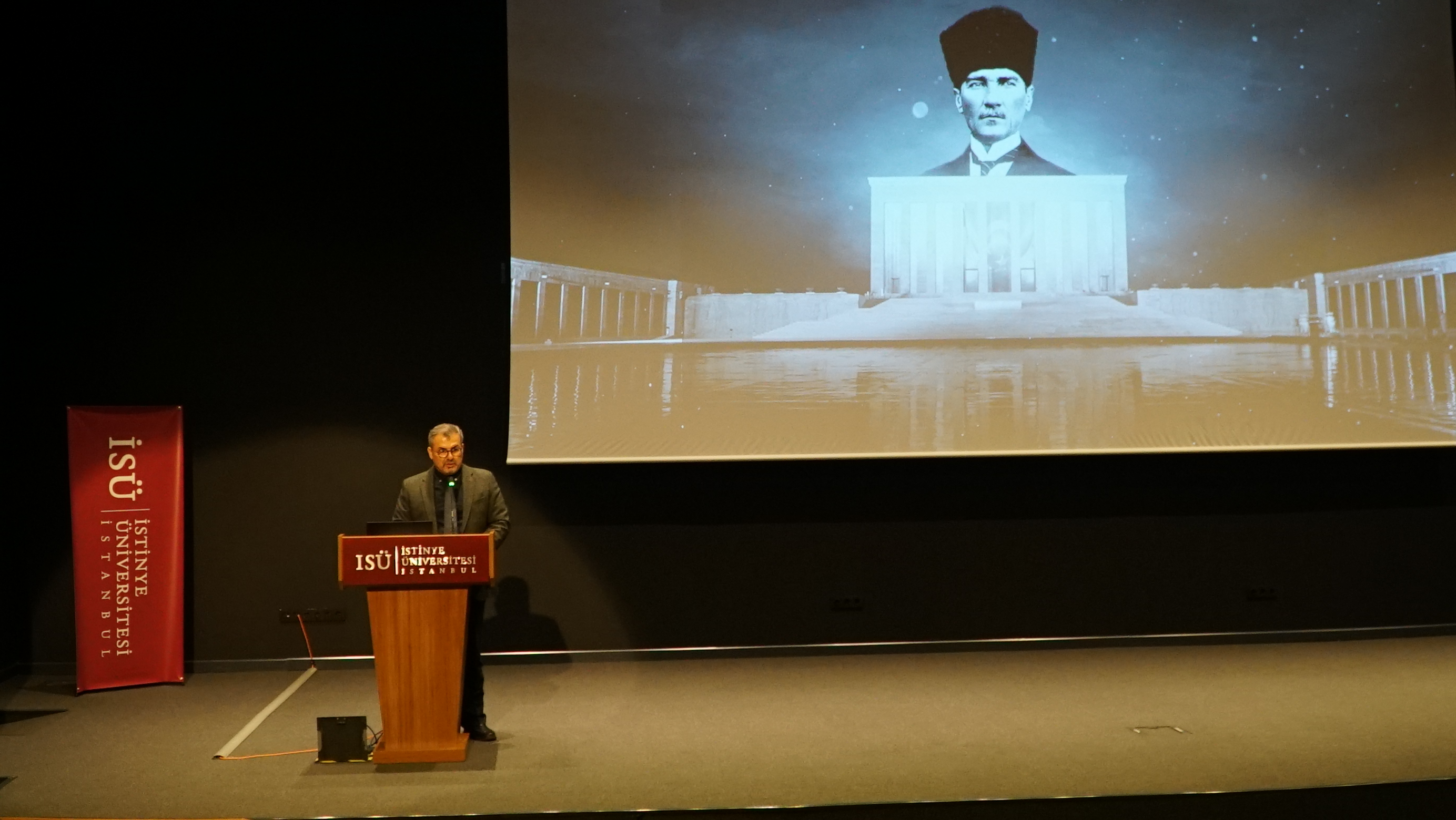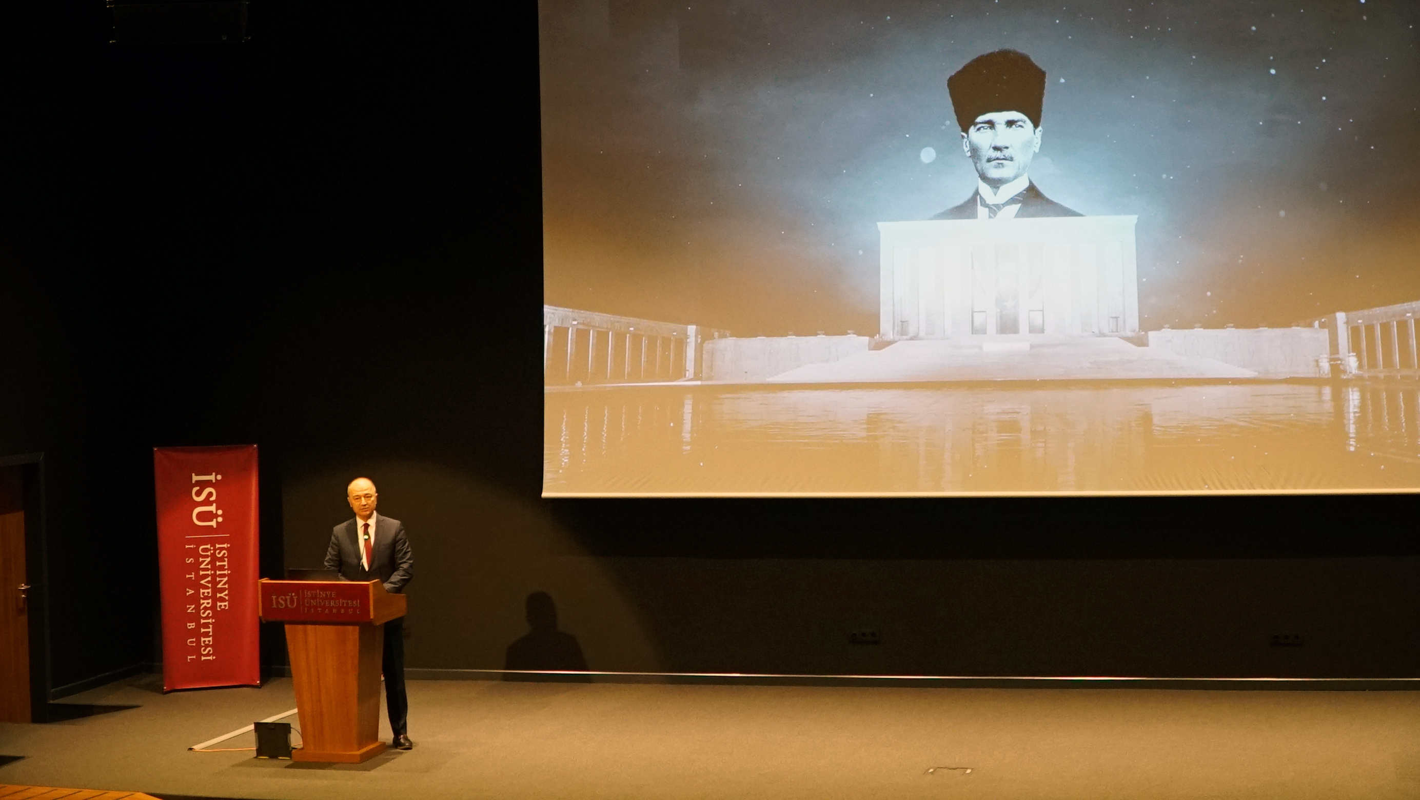 Mustafa Kemal Atatürk’ün milletimize kazandırdığı ve miras bıraktığı değerleri ileriye taşımanın önemine değinen bir konuşma gerçekleştiren Rektörümüz Prof. Dr. Erdal Karaöz, ‘’Atatürk’ün 1938’de bir 10 Kasım sabahı sona eren maddi hayatı şimdi yüreklerimizde ve beyinlerimizde birer Mustafa Kemal ideali olarak yaşıyor ve sonsuza kadar da yaşamaya devam edecek. Atatürk ileriyi gören bir liderdi. Mondros Ateşkes Antlaşması’ndan sonra ortaya çıkan tehlikeli durumu ilk o görüp; milletinin dikkatini çekti. Erzurum Kongresi’nde vatanın bölünmez bir bütün olduğunu tüm dünyaya ilan etti.’’ sözleriyle Atatürk'ün öngörüsüne ve vatan sevgisine vurgu yaptı. İstinye Üniversitesi Ailesi olarak Atatürk’ün bıraktığı mirası korumak, geliştirmek ve ilkelerine bağlı kalmak adına sadece 10 Kasım’larda değil her gün gayret içinde olduklarını vurgulayan ve bu bağlamda yurtsever, dürüst, çalışkan ve hedefleri olan nesiller yetiştirmede akademisyenlerin üzerine düşen görevlere değinen Prof. Dr. Erdal Karaöz, ‘’Mustafa Kemal Atatürk hedefleri olan ve bu hedeflere emin adımlarla yürüyen genç nesiller inşa etmeyi arzulamıştır. Bu noktada sizlere düşen görev, onun hedeflediği gelişmiş, çağdaş ve güçlü bir Türkiye için kurduğu Cumhuriyet’e sonsuza dek sahip çıkmaktır. Bu konuda bizim sizlere olan inancımız eksiksiz ve tamdır.’’ sözleriyle gençlere seslendi.