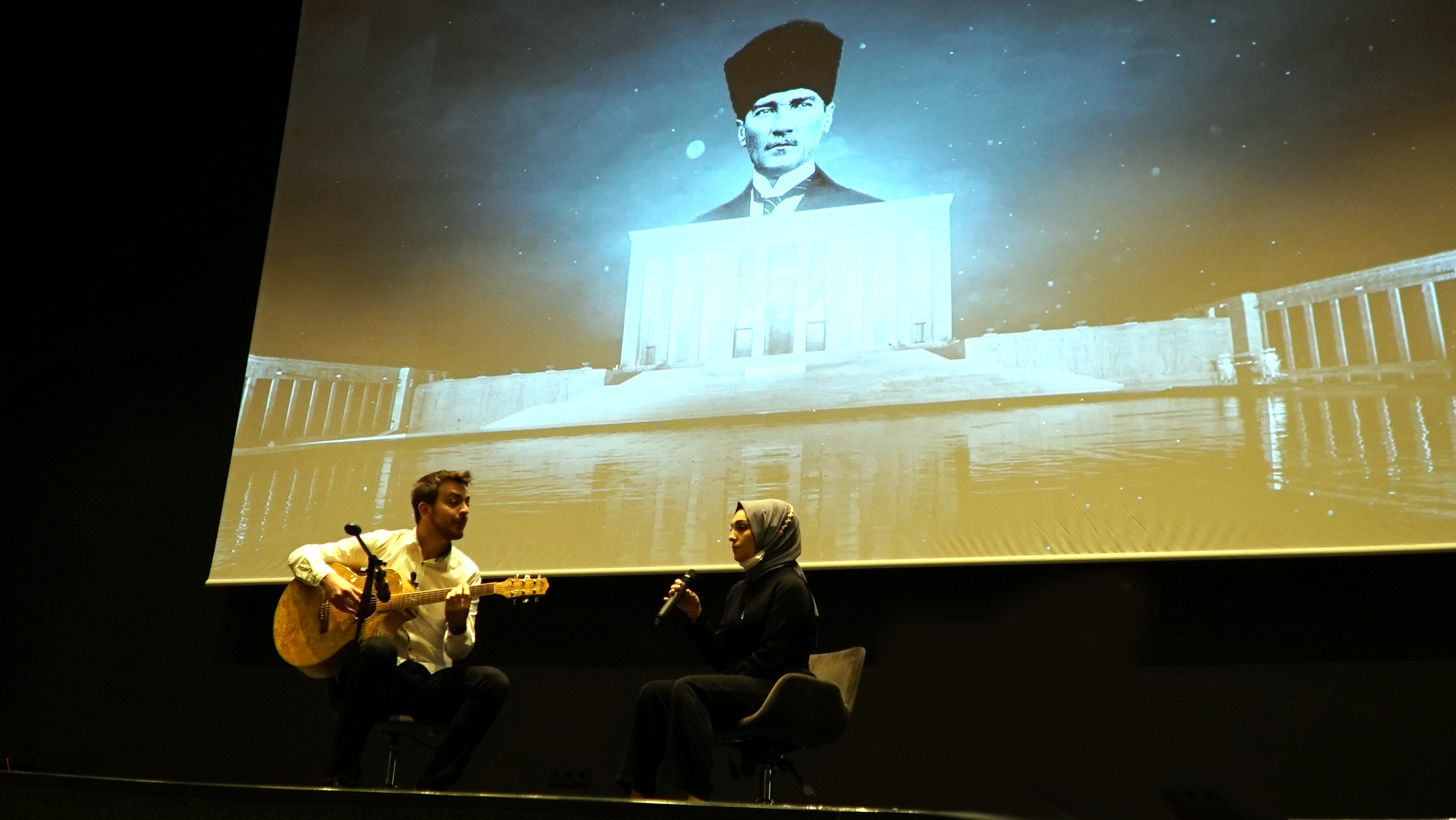 Törende yaptığı konuşmada Atatürk’ün fikirlerini ilke edinerek çağdaş uygarlık seviyesinin üstüne çıkmayı kendilerine hedef olarak belirlediklerini vurgulayan Eczacılık Fakültesi öğrencimiz Sena Onuk, ulu önderin ‘’Beni görmek demek mutlaka yüzümü görmek değildir. Benim fikirlerimi, benim duygularımı anlıyorsanız ve hissediyorsanız bu kafidir’’ sözünü hatırlatarak, akıl ve bilim yolunda ilerlemede gençlerin üstlerine düşen görevin farkında olduklarını söyledi. Öğrencimizin günün önemine ilişkin yaptığı konuşmadan sonra sahne alan müzik kulübü öğrencilerimiz Atatürk’ün sevdiği şarkıları seslendirdi.