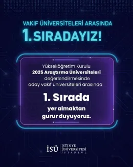 İstinye Üniversitesi olarak, Yükseköğretim Kurulu (YÖK) tarafından açıklanan 2025 Araştırma Üniversiteleri değerlendirmesinde aday vakıf üniversiteleri arasında 1. sırada yer almaktan büyük bir gurur duyuyoruz. Bu sonuç, üniversitemizin araştırma kültürünü güçlendirme, bilimsel üretkenliği artırma ve uluslararası akademik görünürlüğü yükseltme konusundaki kararlı ilerleyişinin güçlü bir yansımasıdır.