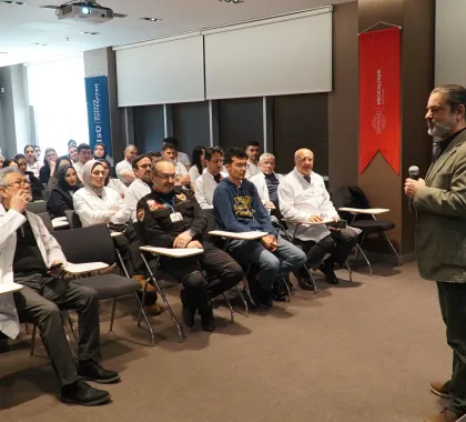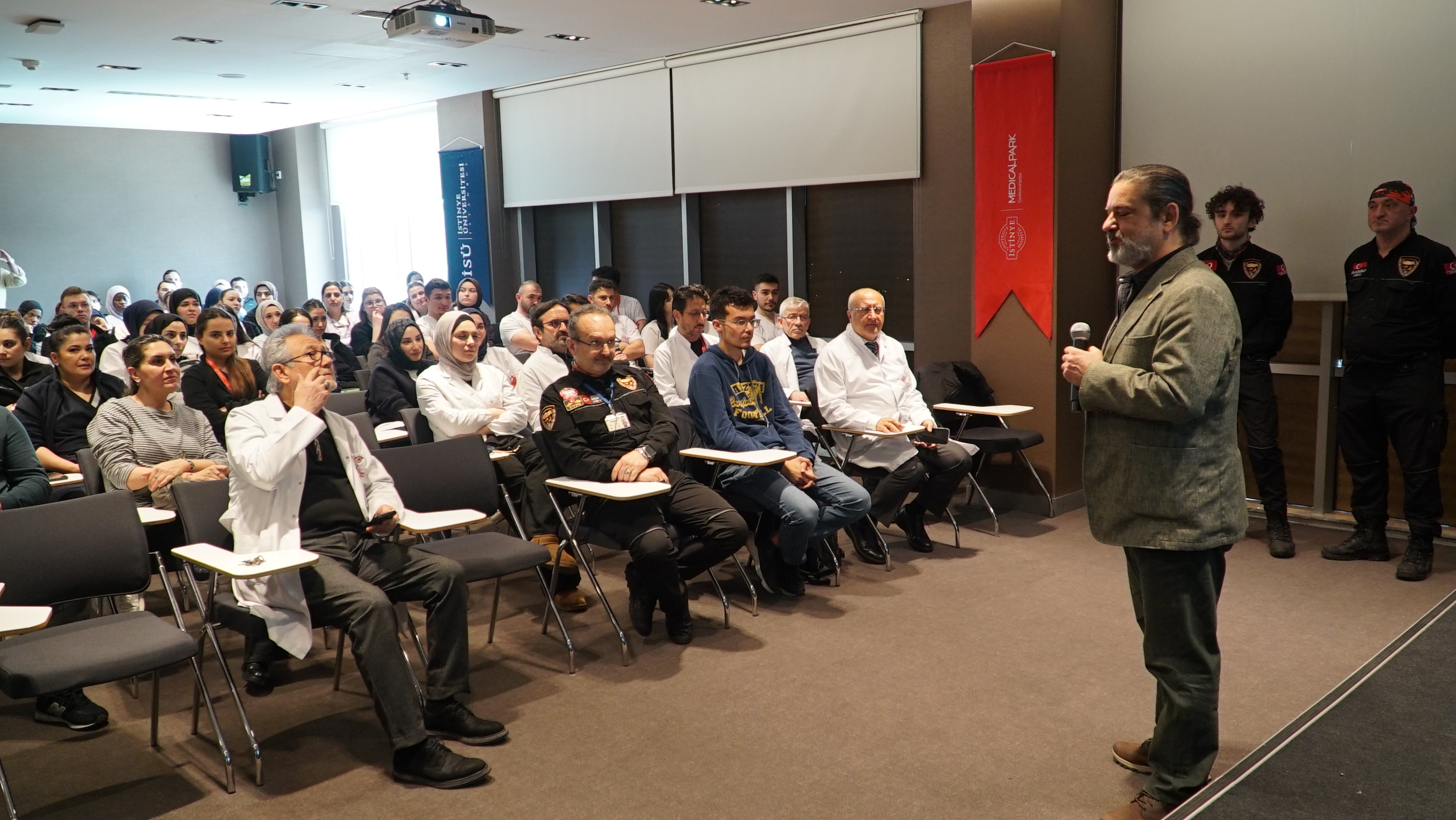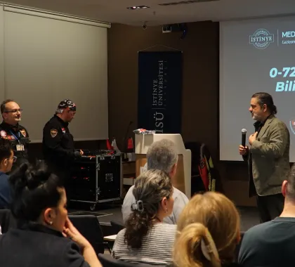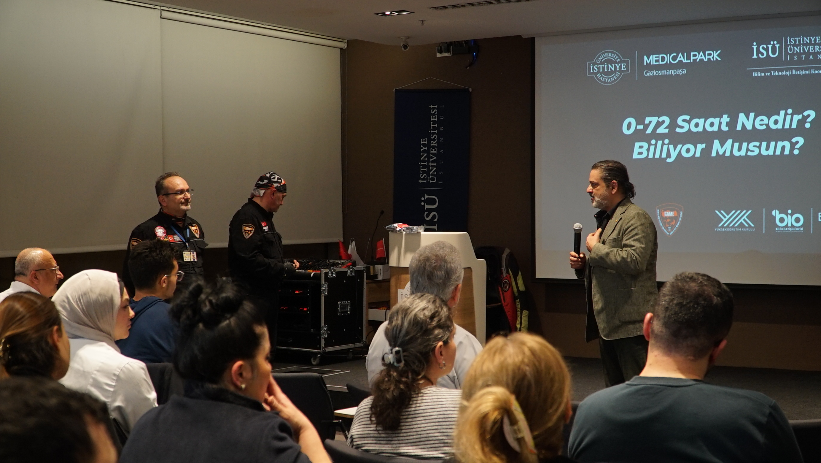 Etkinlik kapsamında İstinye Üniversitesi Arama Kurtarma Kulübü Başkanı Umut Kaan Güven ile İstinye Üniversitesi Hastanesi Medicalpark Gaziosmanpaşa Başhekimi Dr. Öğr. Üyesi Mustafa Cantürk, afet anlarında koordinasyon, müdahale süreçleri ve sağlık hizmetlerinin rolüne ilişkin önemli bilgiler paylaştı.