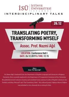 Konuşmacı Doç. Dr. Nazmi AĞIL, 26.12.2019 tarihinde "Translating Poetry, Transforming Myself" başlıklı bir sunum gerçekleştirmiştir.