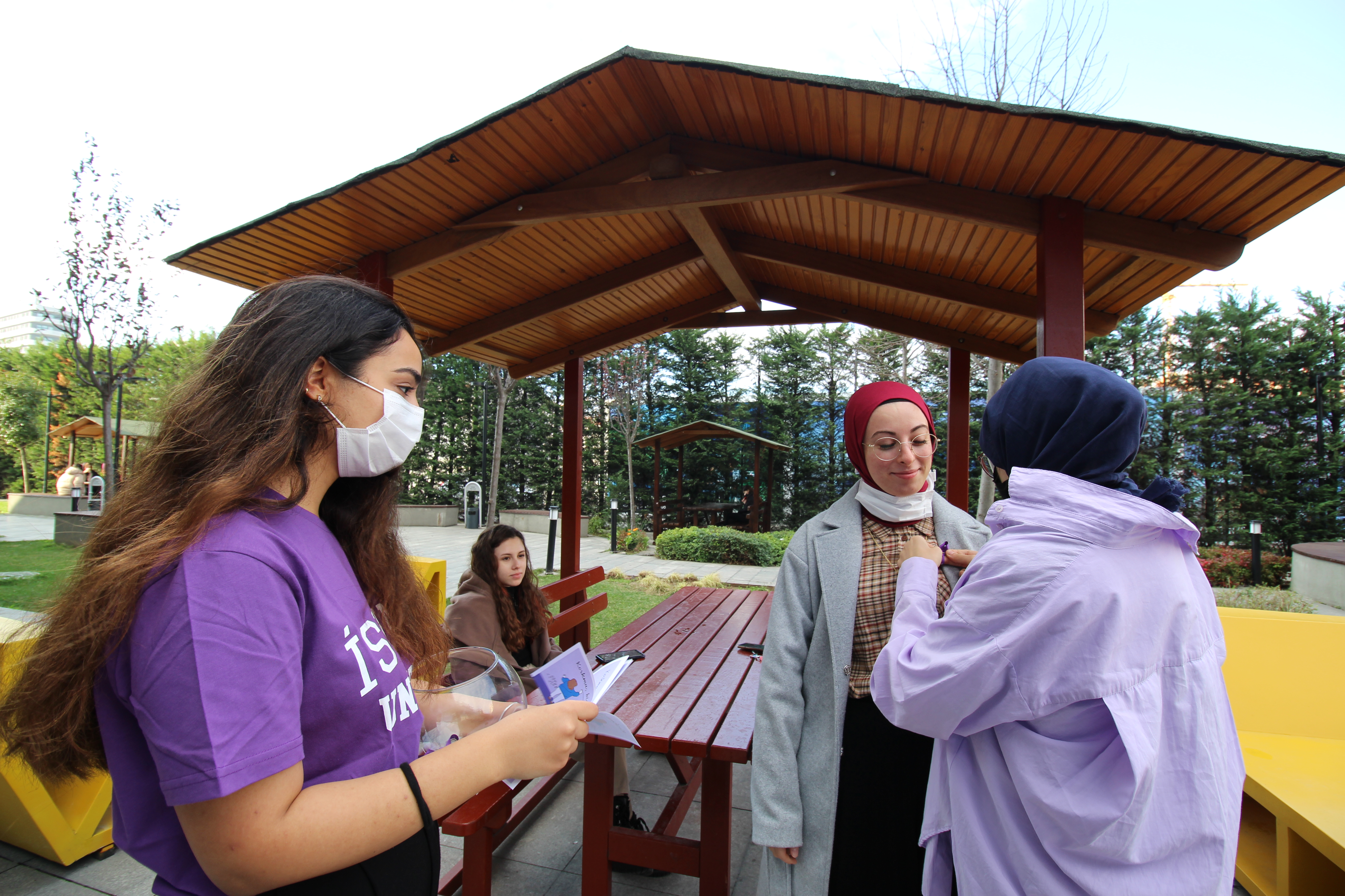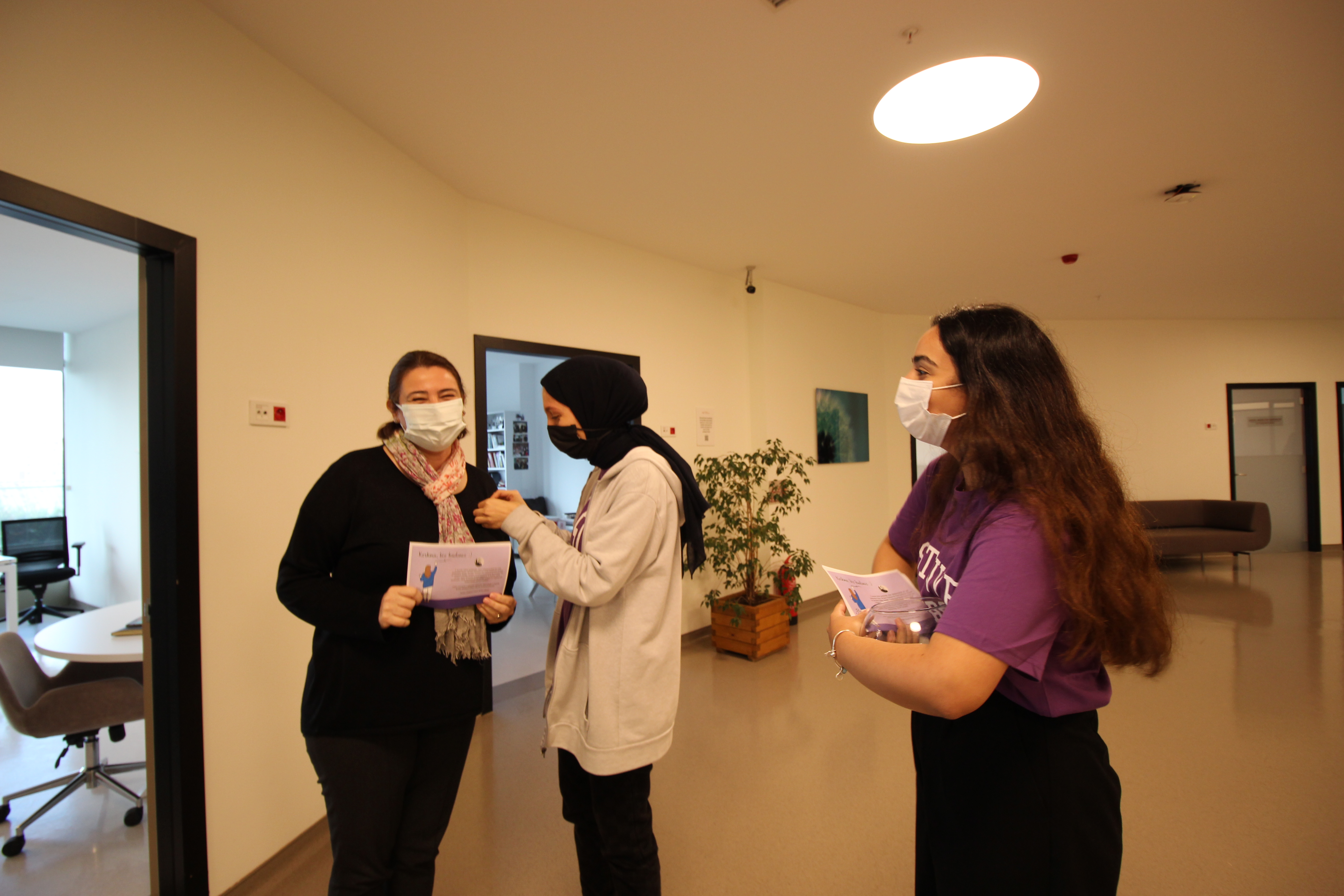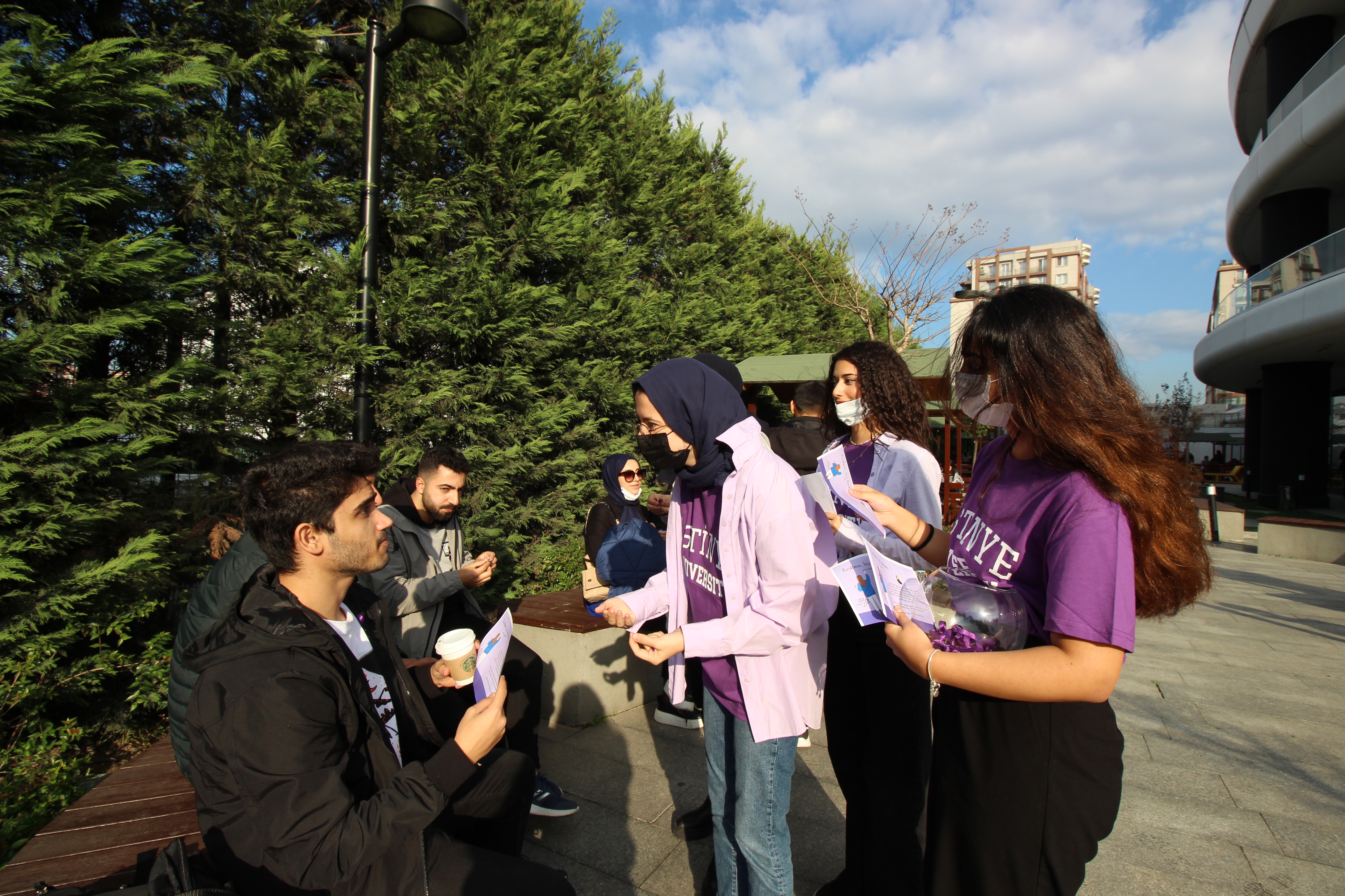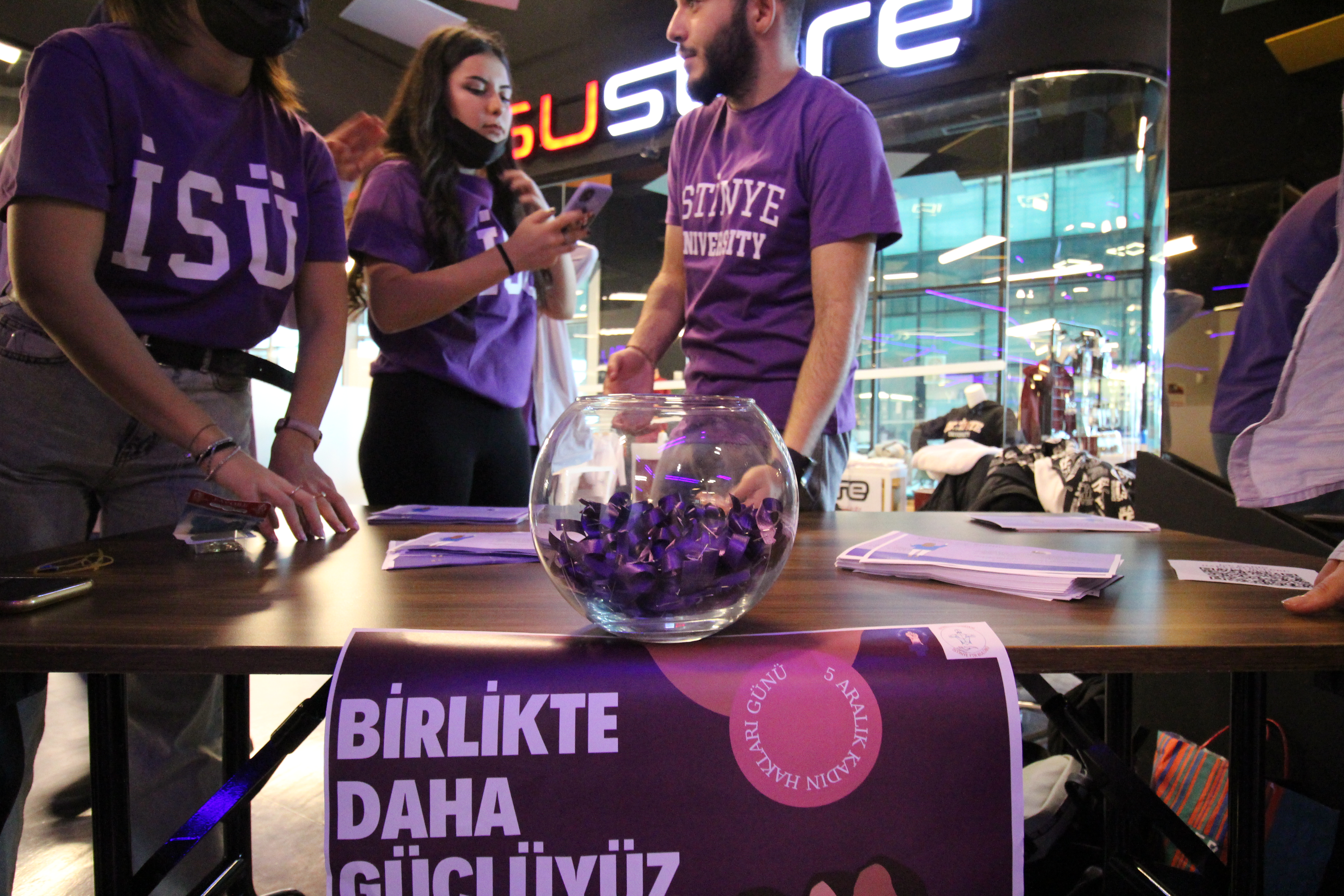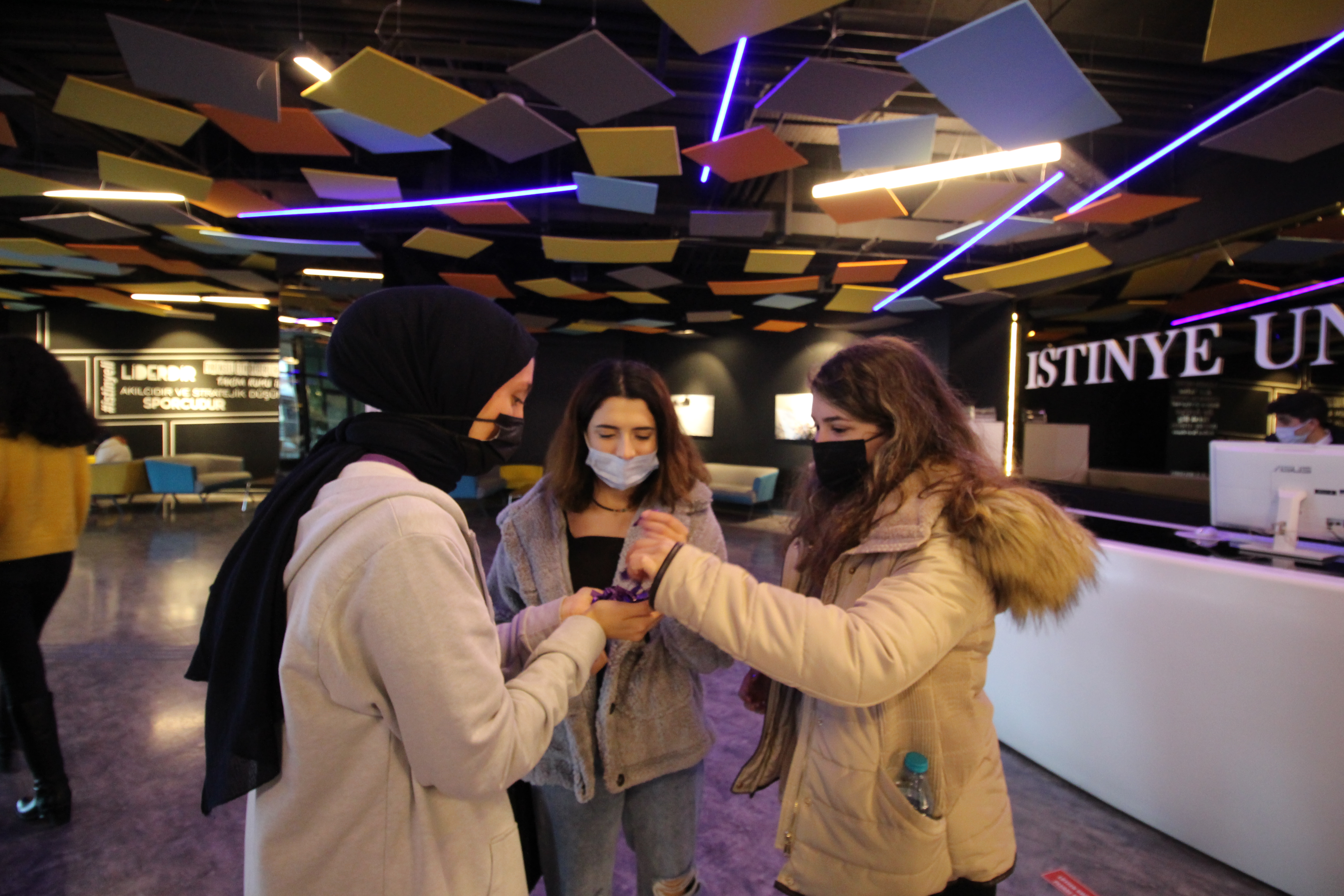İstinye Üniversitesi Sağlık Bilimleri Fakültesi Dekanı Prof. Dr. İsmet Tamer’in desteğiyle gerçekleşen etkinlikler boyunca; Topkapı Kampüste farkındalık oluşturmak adına mor kurdele dağıtan İSÜ FTR Kulübü öğrencileri, 5 Aralık Dünya Kadın Hakları günü hakkında bilgi paylaşımında bulundu. Dünyadaki ve toplumumuzdaki kadına şiddet konusuna dikkat çeken öğrenciler, İstinyelileri eşitliğin rengi olan mor giyinmeye davet etti.