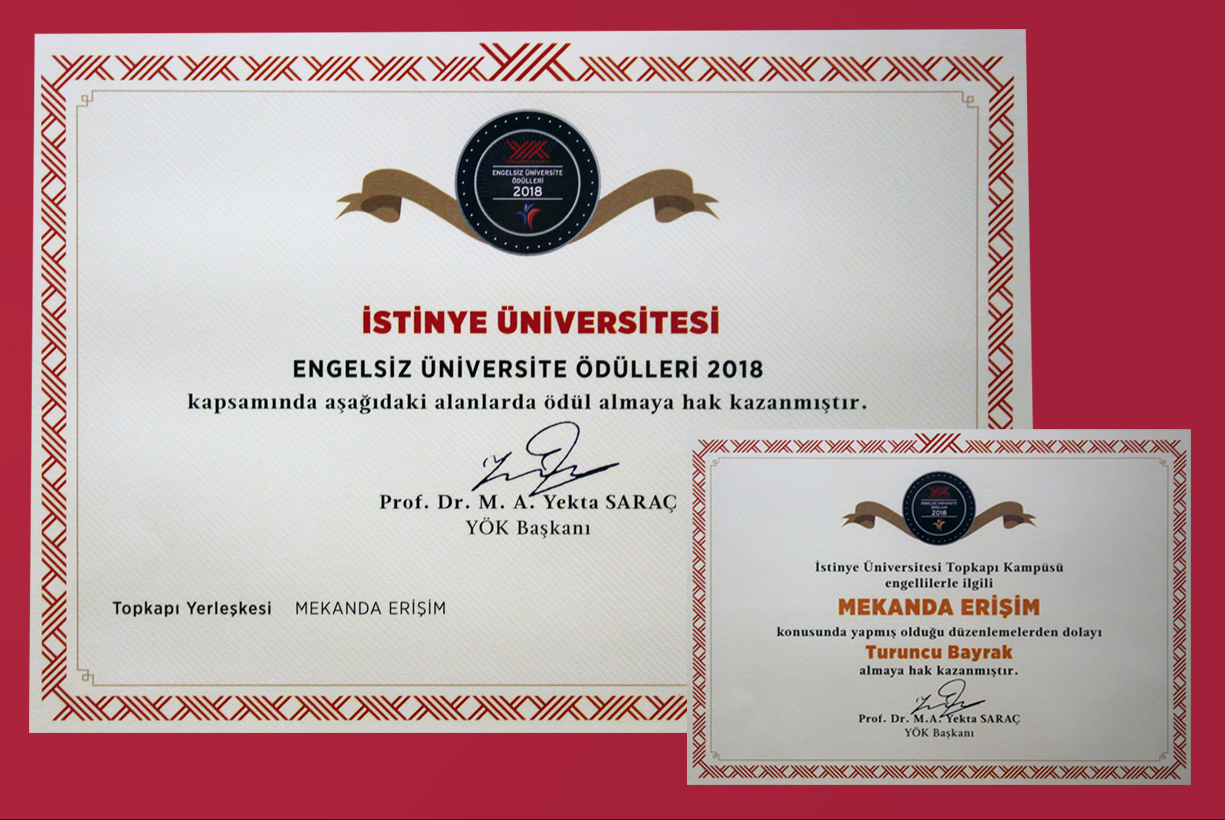 İstinye Üniversitesi Topkapı Kampüsü; YÖK tarafından verilen Engelsiz Üniversite Ödülüne layık görülerek, engellilerle ilgili "Mekanda Erişim" konusunda yapmış olduğu düzenlemelerden dolayı Turuncu Bayrak almaya hak kazandı.