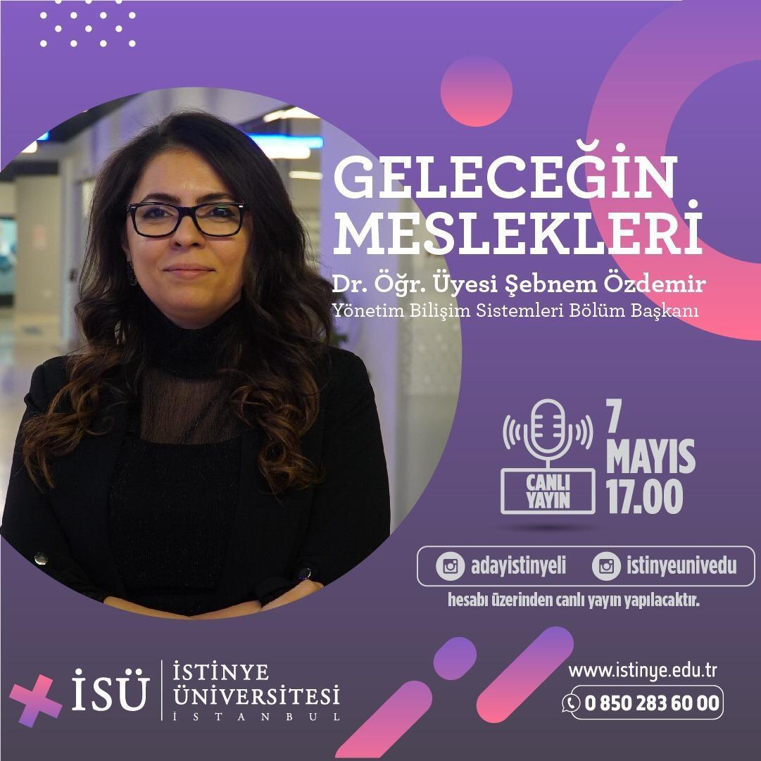 Günümüz dünyasından geleceğe aktarılacak meslekler ve gelecekte yeni orataya çıkacak meslekler üzerine konuşacağımız Üniversitemiz Yönetim Bilişim Sistemleri Bölüm Başkanımız Dr. Öğr. Üyesi Şebnem Özdemir, dijital dönüşümde “Geleceğin Meslekleri” 07.05.2020 Perşembe günü @adayistinyeli & @istinyeunivedu Instagram hesaplarından ortak canlı yayını ile öğrencilerimizle buluşacak.
