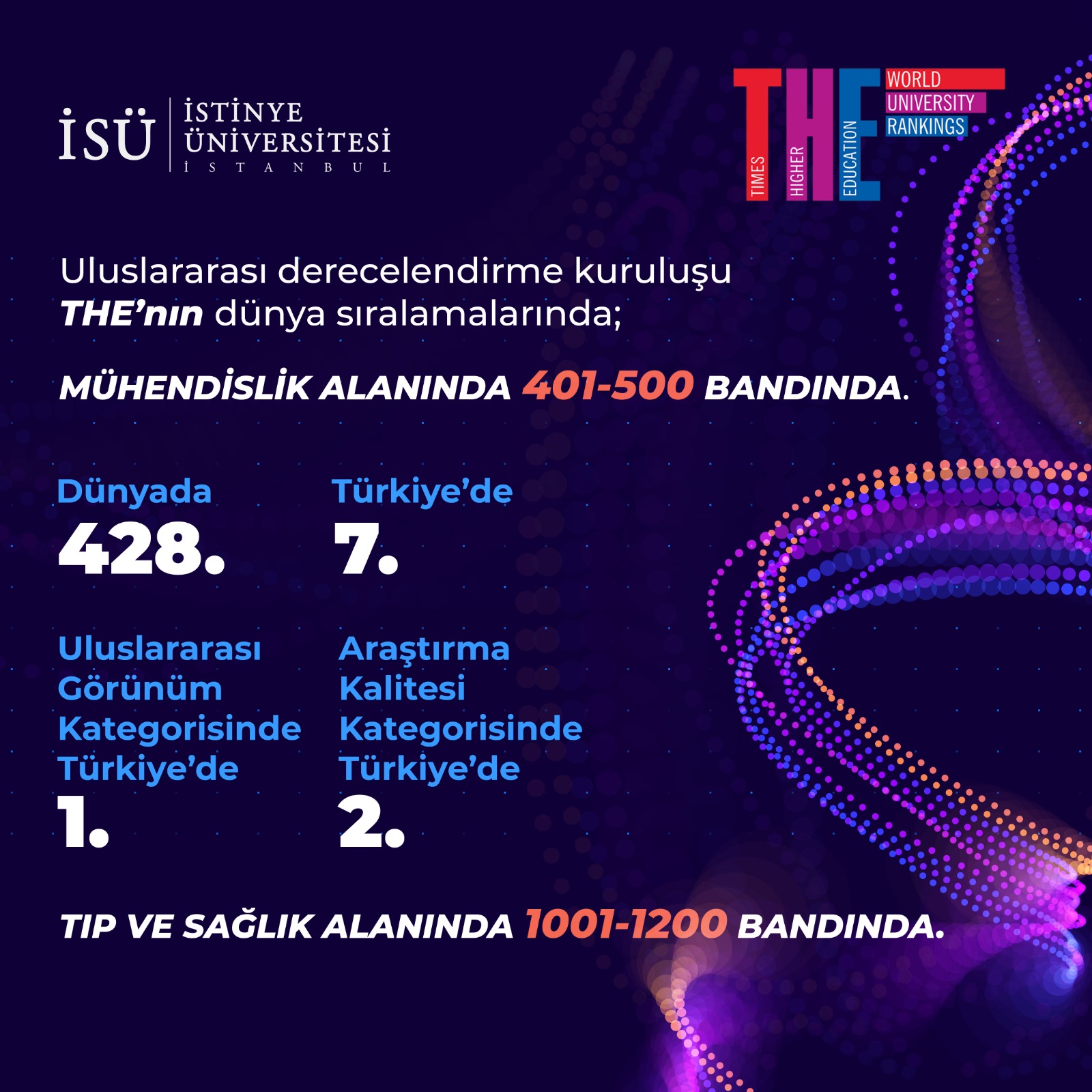 İngiliz üniversite derecelendirme kuruluşu Times Higher Education (THE), dünya genelinde ve toplam 11 alanda 2025 yılının en iyi üniversiteler listesini yayınladı. İstinye Üniversitesi, Mühendislik alanında uluslararası sıralamalarda dünya genelinde 428. olarak, Bilkent ve Boğaziçi Üniversiteleri ile birlikte ilk 400-500 bandında sıralandı. Üniversite, Mühendislik alanında Türkiye sıralamalarında toplam 64 Üniversite arasında yedinci olarak öne çıkarken, Uluslararası Görünüm kategorisinde 1. sıraya, Araştırma Kalitesi kategorisinde 2. sıraya, Tıp ve Sağlık alanında ise Uluslararası Görünüm kategorisinde 6.sıraya başarıyla yerleşti.