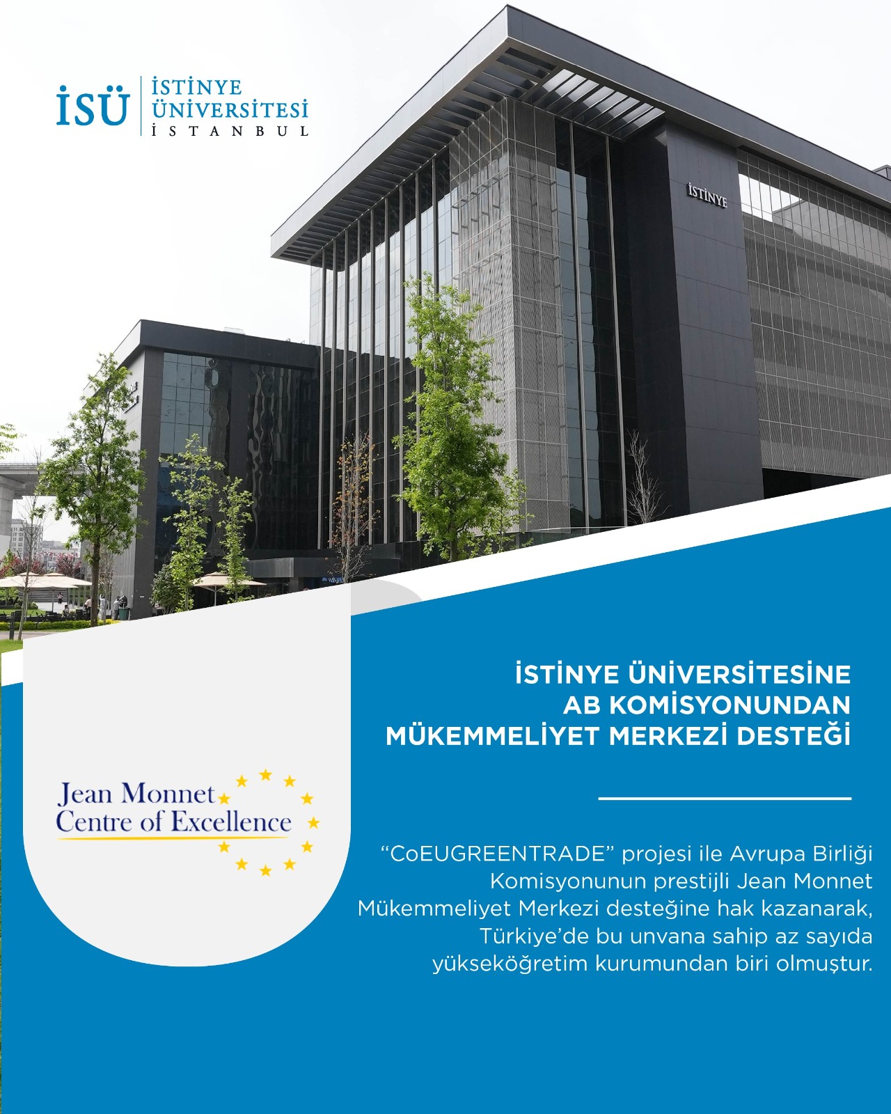 İstinye Üniversitesi, Avrupa Birliği ile Türkiye arasındaki ekonomik, ticari ve sürdürülebilirlik alanlarındaki iş birliğini güçlendirecek önemli bir başarıya imza attı. Üniversitenin “CoEUGREENTRADE: Center of Excellence for EU-Turkey Integration: Trade, Industry and Sustainability” başlıklı projesi, Avrupa Birliği Komisyonu tarafından “Jean Monnet Centre of Excellence” (Mükemmeliyet Merkezi) desteği kapsamında finanse edilmeye hak kazandı.