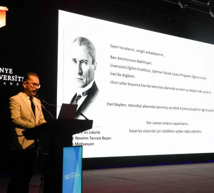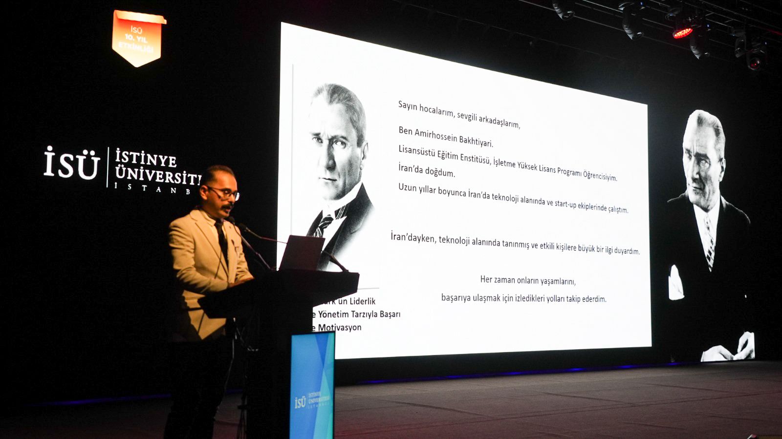 Lisansüstü Eğitim Enstitüsü, İşletme Yüksek Lisans Programı öğrencimiz Amirhossein Bakhtiyari de Atatürk’ün lider yönünün kendi hayatında ona nasıl rehberlik ettiğine dair bir konuşma gerçekleştirdi. Amirhossein Bakhtiyari "Mustafa Kemal Atatürk, kendi zamanının yıllar ötesinde bir insandı. Onun farkı, bakış açısıydı. İnsanlar yeri görürken o gökleri, insanlar dağı görürken o dağın kalbini gören bir liderdi. Onun bu yönünü araştırdığımda hayatımda önemli bir yer edindi. Kendisini saygı ve minnetle anıyorum” dedi.