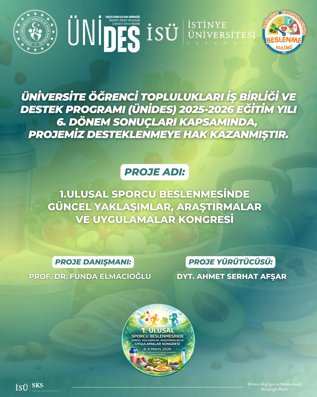 İstinye Üniversitesi Sağlığın Korunmasında Beslenme Kulübü tarafından hazırlanan proje, Gençlik ve Spor Bakanlığı Gençlik Hizmetleri Genel Müdürlüğü tarafından yürütülen Üniversite Öğrenci Toplulukları İş Birliği ve Destek Programı (ÜNİDES) kapsamında desteklenmeye hak kazandı. ÜNİDES 2025–2026 Eğitim Yılı 6. Dönemi kapsamında desteklenen proje doğrultusunda, “1. Ulusal Sporcu Beslenmesinde Güncel Yaklaşımlar, Araştırmalar ve Uygulamalar Kongresi” düzenlenecek.