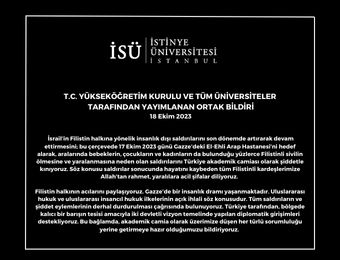 İsrail’in Filistin halkına yönelik insanlık dışı saldırılarını son dönemde artırarak devam ettirmesini; bu çerçevede 17 Ekim 2023 günü Gazze’deki El-Ehli Arap Hastanesi’ni hedef alarak, aralarında bebeklerin, çocukların ve kadınların da bulunduğu yüzlerce Filistinli sivilin ölmesine ve yaralanmasına neden olan saldırılarını Türkiye akademik camiası olarak şiddetle kınıyoruz. Söz konusu saldırılar sonucunda hayatını kaybeden tüm Filistinli kardeşlerimize Allah’tan rahmet, yaralılara acil şifalar diliyoruz. Filistin halkının acılarını paylaşıyoruz. Gazze’de bir insanlık dramı yaşanmaktadır. Uluslararası hukuk ve uluslararası insancıl hukuk ilkelerinin açık ihlali söz konusudur. Tüm saldırıların ve şiddet eylemlerinin derhal durdurulması çağrısında bulunuyoruz. Türkiye tarafından, bölgede kalıcı bir barışın tesisi amacıyla iki devletli vizyon temelinde yapılan diplomatik girişimleri destekliyoruz. Bu bağlamda, akademik camia olarak üzerimize düşen her türlü sorumluluğu yerine getirmeye hazır olduğumuzu bildiriyoruz.