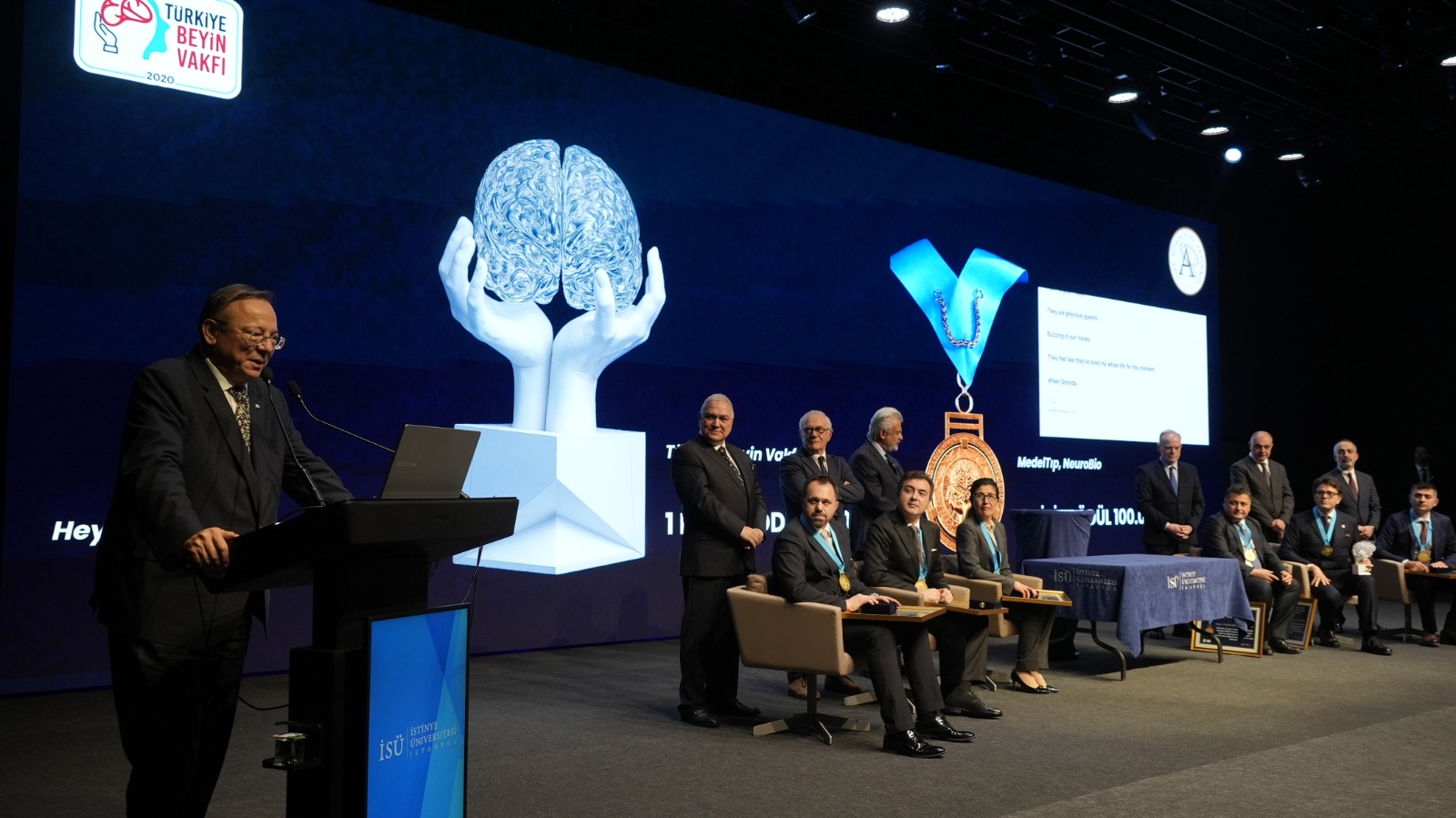 “Bu doğrultuda, Türkiye Beyin Vakfı olarak Türk Nöroşirürji Akademisi ile birlikte ortak bir çalışma yürüttük. Seçimin, Türk Nöroşirürji Akademisi tarafından belirlenen bir jüri tarafından yapılacağı şekilde bir organizasyon planladık. Bu organizasyon kapsamında toplam 12 başvuru arasından 6 finalist seçildi. Bu 6 finalist, arkamdaki tabloda gördüğünüz kişiler. Biraz sonra jürinin yapacağı son toplantıyla bu finalistler arasından bir kişi birinci olarak belirlenecek. Finalistlerin bu başarıyı nasıl elde ettiklerini, meslektaşlarına ve kendilerinden sonraki nesillere yönelik önerilerini ise birazdan kendilerinden dinleyeceğiz. Dolayısıyla amacımız, Türk beyin cerrahisinin bugün sahip olduğu üst düzey bilimsel seviyeyi gelecekte de sürdürebilmesi için bu bayrağı yeni nesillere aktarmaktır.”