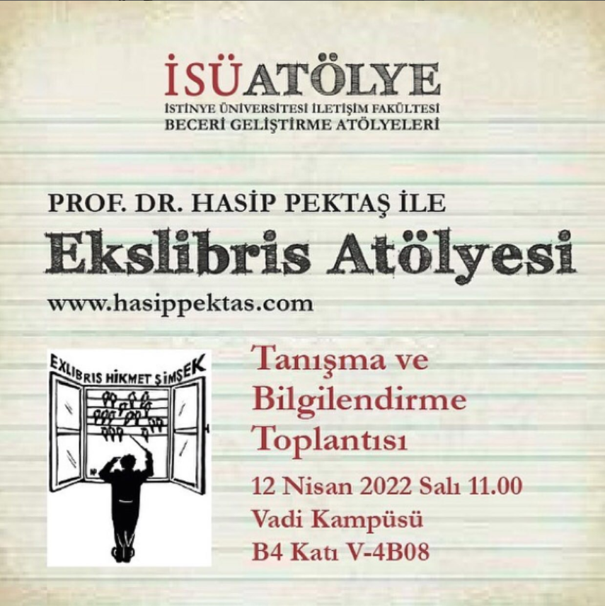 İSÜ İletişim Fakültesi Beceri Geliştirme Atölyeleri kapsamındaki Ekslibris Atölyesi, İstanbul Ekslibris Derneği Başkanı ve Görsel İletişim Tasarımı bölümü öğretim üyesi Prof Dr. Hasip Pektaş koordinatörlüğünde 12 Nisan Salı günü saat 11.00’da başladı.