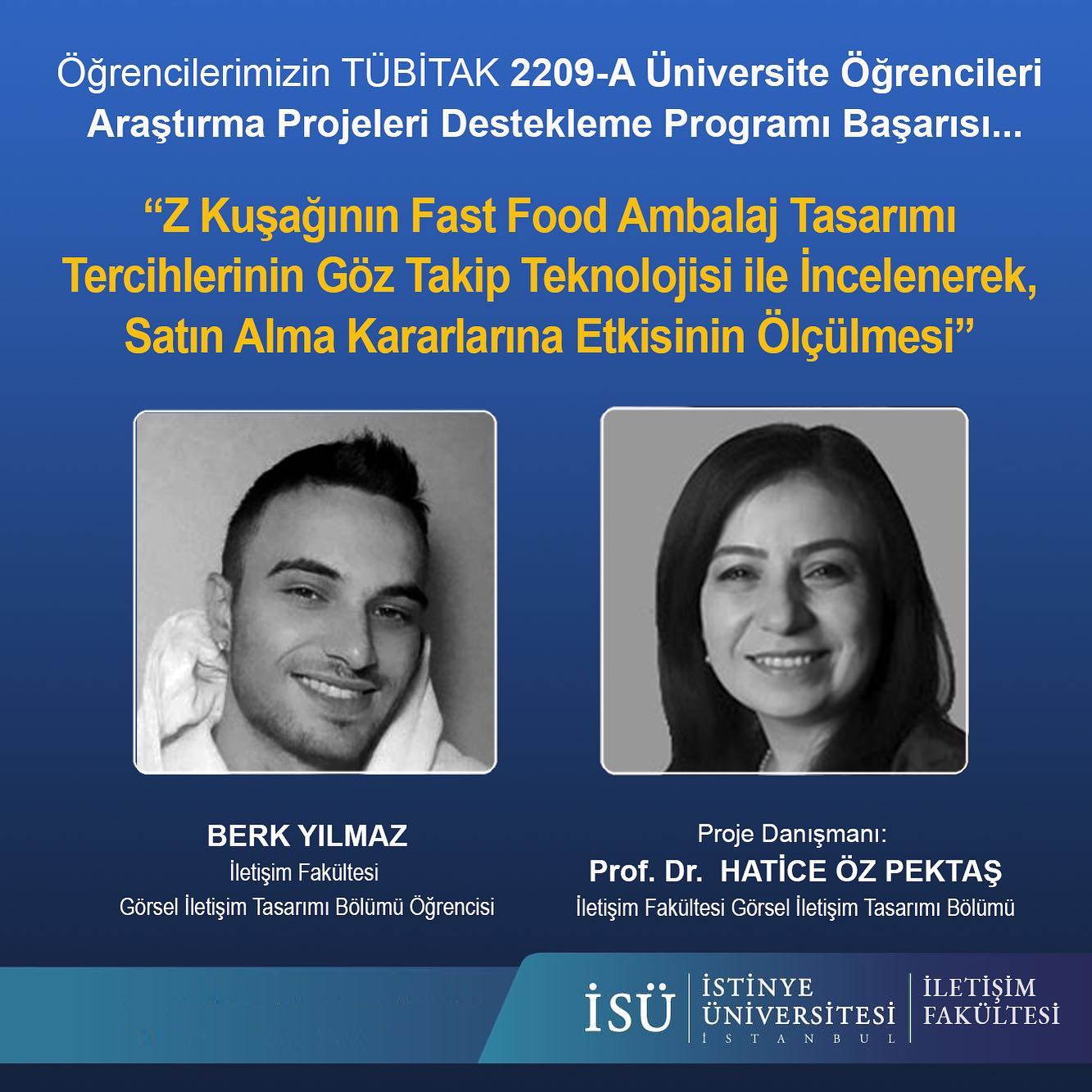 İstinye Üniversitesi İletişim Fakültesi Görsel İletişim Tasarımı Bölümü öğrencimiz BERK YILMAZ’ın Görsel İletişim Tasarımı Bölümü öğretim üyesi Prof. Dr. Hatice Öz Pektaş danışmanlığındaki “Z Kuşağının Fast Food Ambalaj Tasarımı Tercihlerinin Göz Takip Teknolojisi ile İncelenerek, Satın Alma Kararlarına Etkisinin Ölçülmesi” başlıklı projesi Tubitak 2209-A Üniversite Öğrencileri Araştırma Projeleri Desteği kapsamında desteklenmeye uygun bulunmuştur.