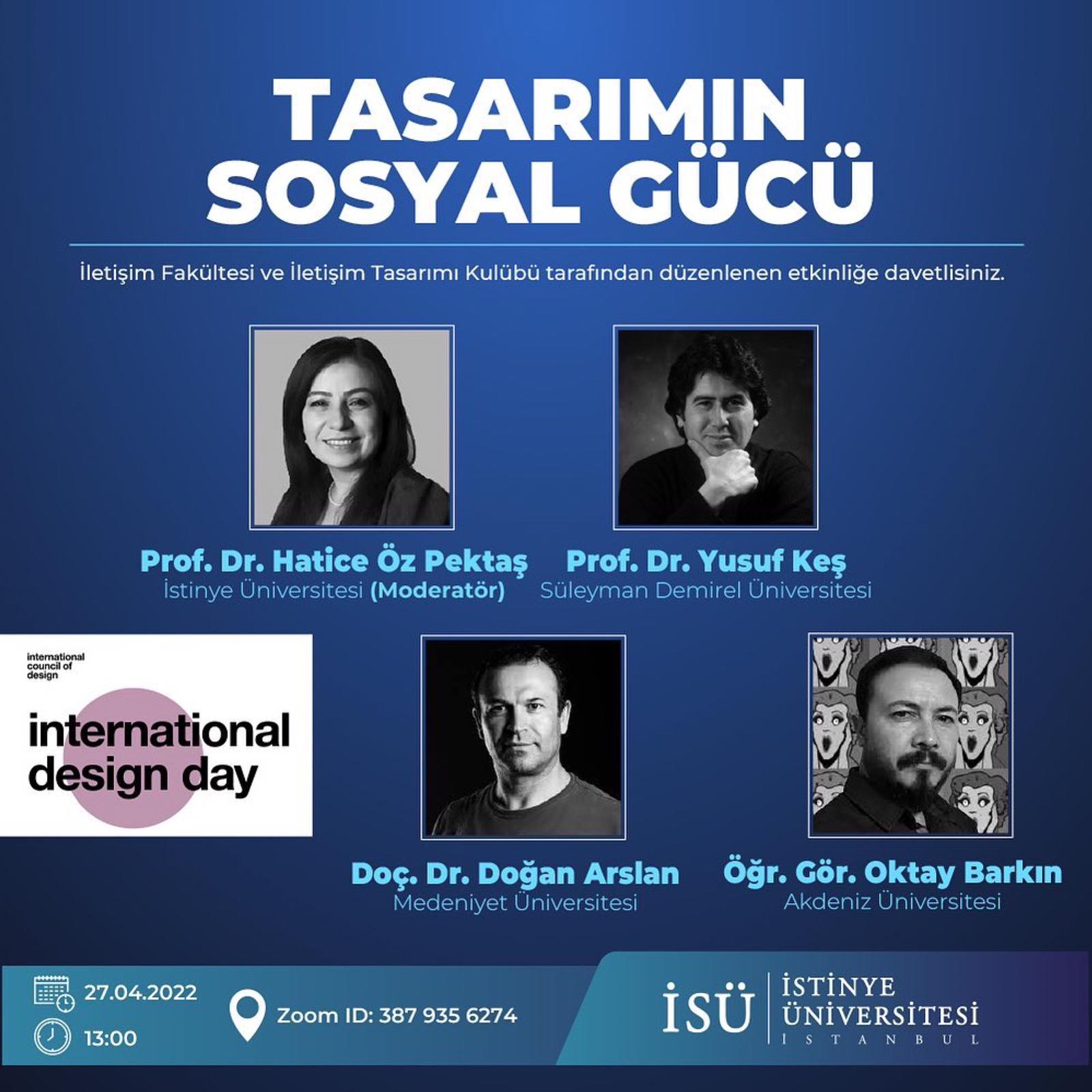 Panel konuklarının Prof. Dr. Yusuf Keş (Süleyman Demirel Üniversitesi), Doç. Dr. Doğan Arslan (İstanbul Medeniyet Üniversitesi) ve Öğr. Gör. Oktay Barkın (Akdeniz Üniversitesi) olduğu etkinlikte moderatörlüğü İstinye Üniversitesi İletişim Fakültesi Görsel İletişim Tasarımı bölüm başkanı Prof. Dr. Hatice Öz Pektaş üstlendi. Konuklar, söyleşinin yanı sıra kendi sosyal çalışmalarına dair örnekleri paylaştı.