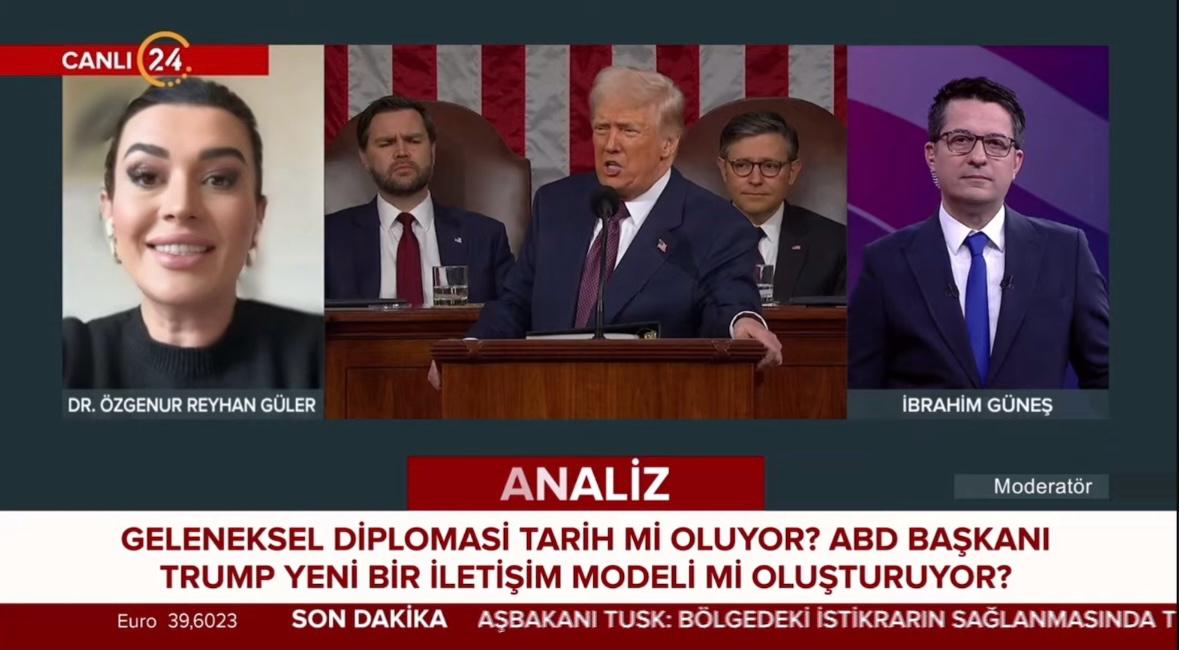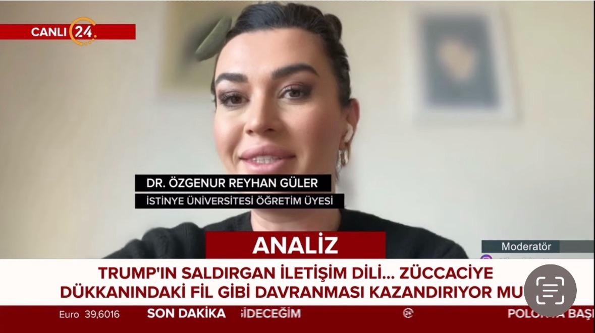 24 TV haber bülteninde, İstinye Üniversitesi İletişim Fakültesi Öğretim Üyesi Dr. Özgenur Reyhan Güler, ABD Başkanı Donald Trump’ın iletişim dili ve diplomasi anlayışı üzerine değerlendirmelerde bulundu.