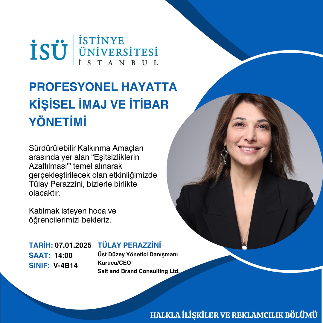Sürdürülebilir Kalkınma Amaçları listesinde yer alan “Eşitsizliklerin Azaltılması” temel alınarak Halkla İlişkiler ve Reklamcılık bölümü tarafından gerçekleştirilecek olan "Profesyonel Hayatta Kişisel İmaj ve İtibar Yönetimi" üzerine yapılacak etkinliğimize tüm hoca ve öğrencilerimizi bekleriz.