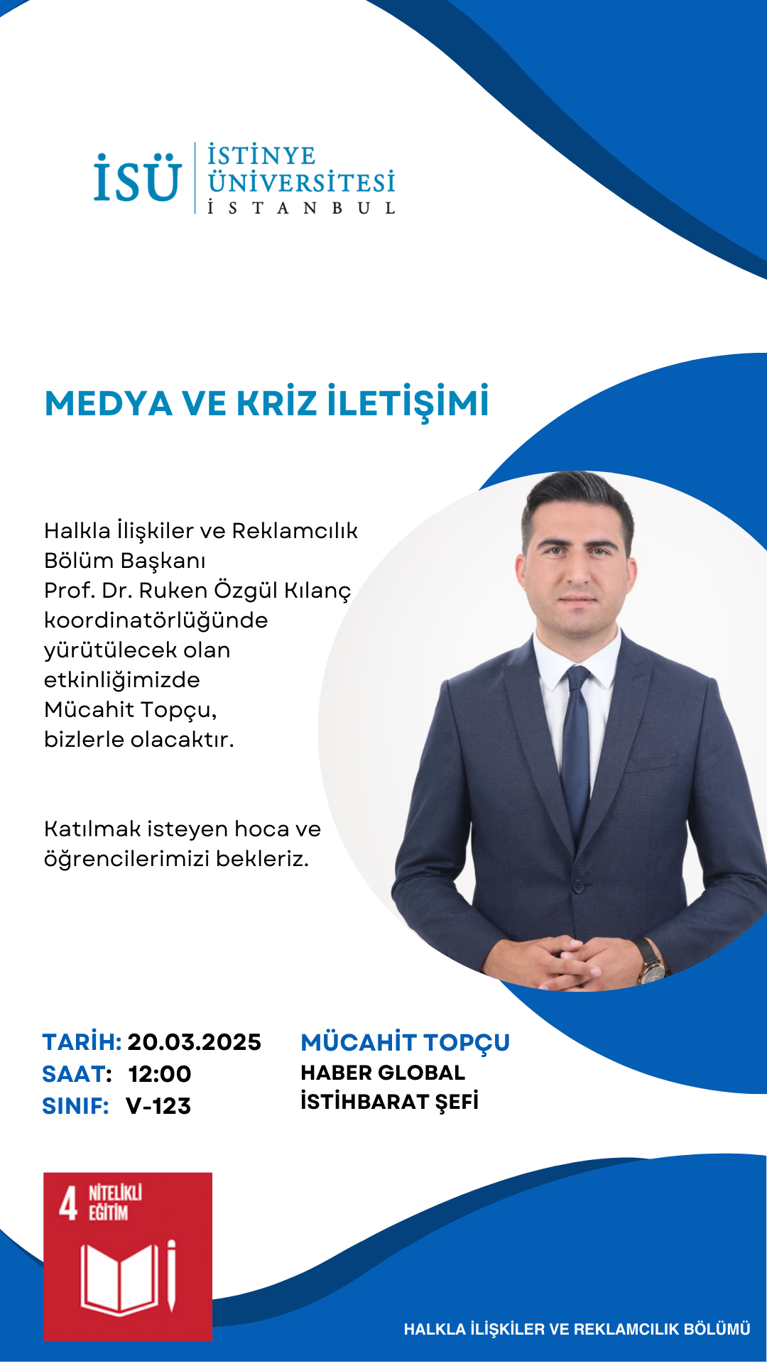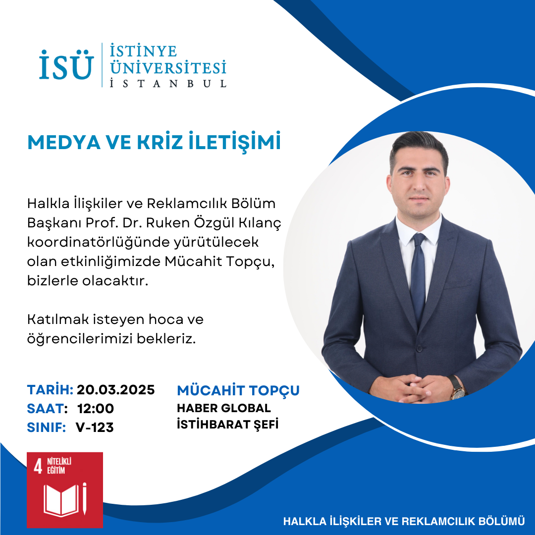 Halkla İlişkiler ve Reklamcılık Bölüm Başkanı Prof. Dr. Ruken Özgül Kılanç koordinatörlüğünde yürütülecek olan etkinliğimizde Mücahit Topçu, bizlerle birlikte olacaktır.