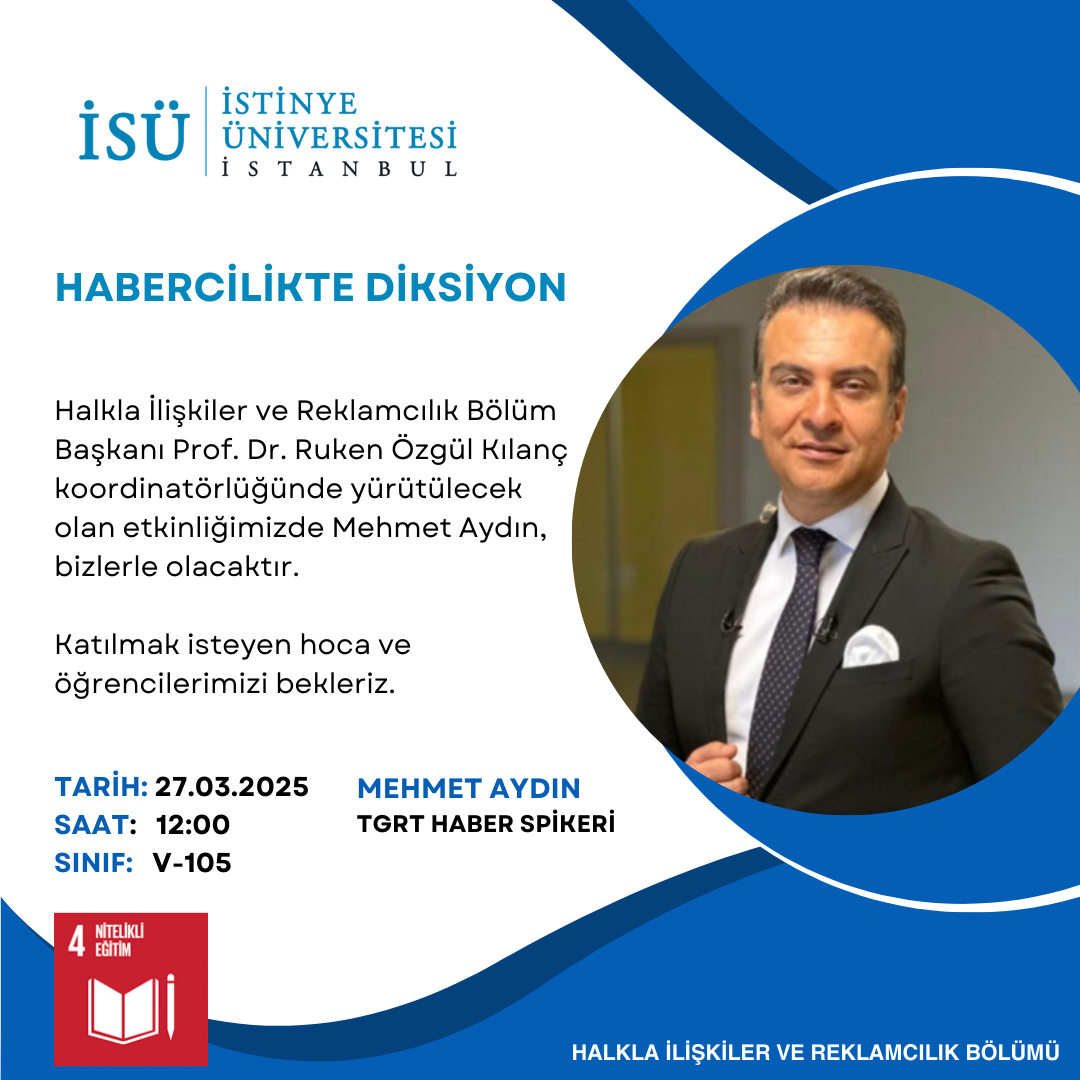 Halkla İlişkiler ve Reklamcılık Bölüm Başkanı Prof. Dr. Ruken Özgül Kılanç koordinatörlüğünde yürütülecek olan etkinliğimizde Mehmet Aydın, bizlerle birlikte olacaktır.