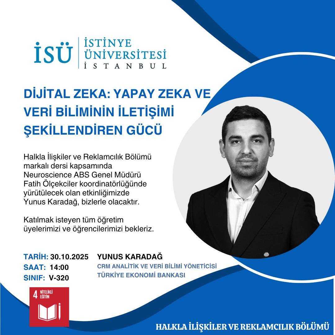 Halkla İlişkiler ve Reklamcılık Bölümü markalı dersi kapsamında Neuroscience ABS Genel Müdürü Fatih Ölçekciler koordinatörlüğünde yürütülecek olan etkinliğimizde Yunus Karadağ, bizlerle birlikte olacaktır.