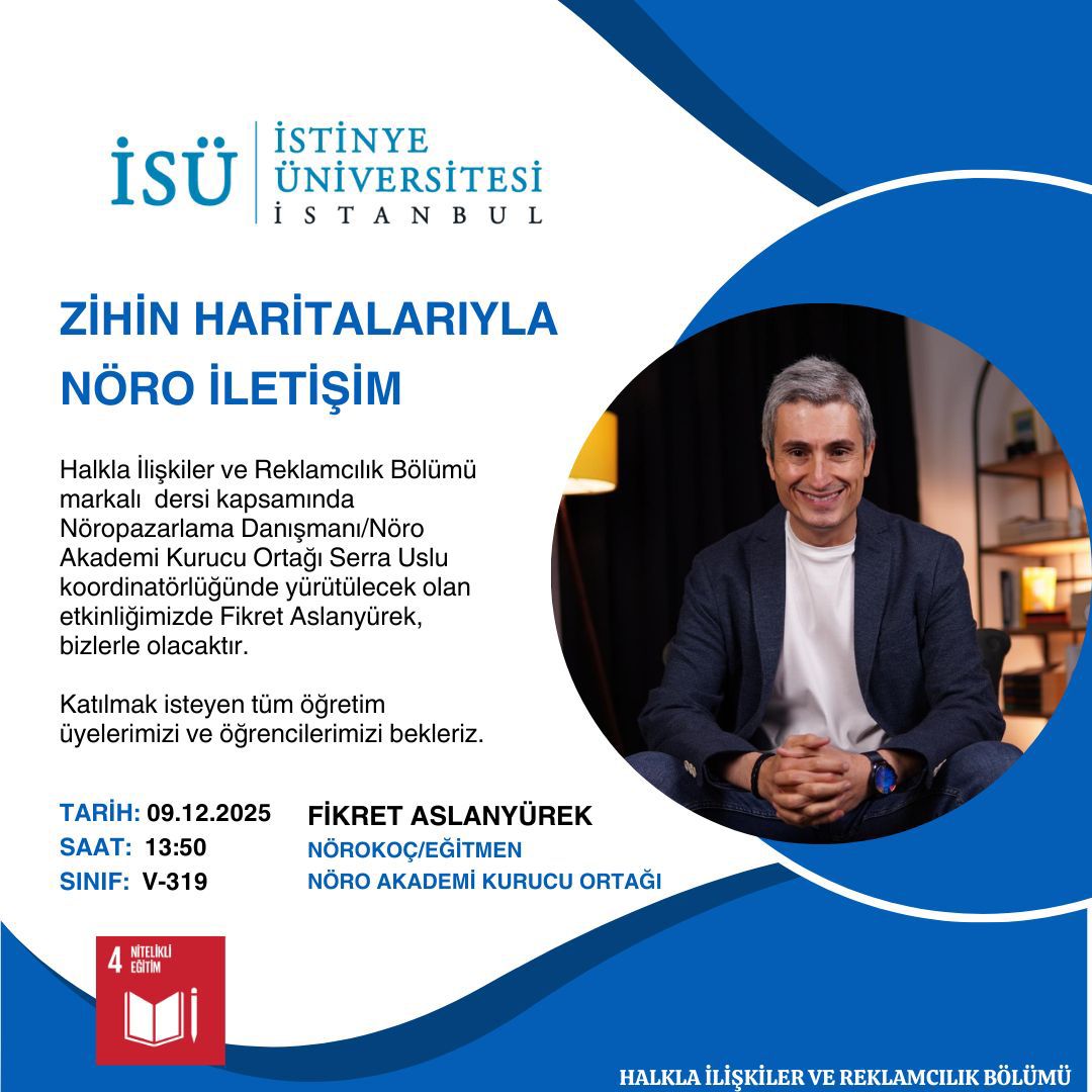 Halkla İlişkiler ve Reklamcılık Bölümü markalı dersi kapsamında Nöropazarlama Danışmanı/ Nöro Akademi Kurucu Ortağı Serra Uslu koordinatörlüğünde yürütülecek olan etkinliğimizde Fikret Aslanyürek, bizlerle birlikte olacaktır.